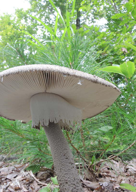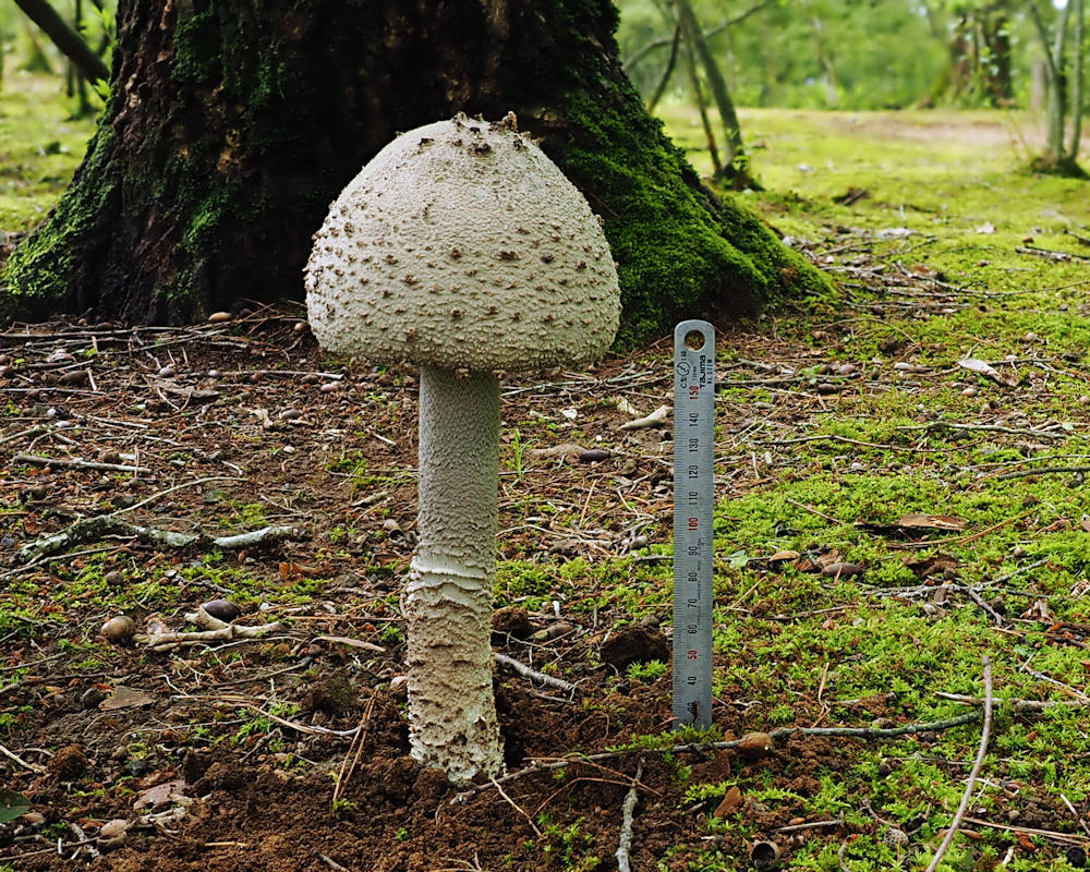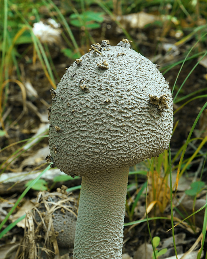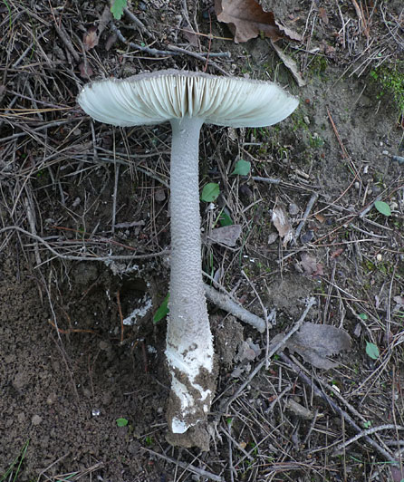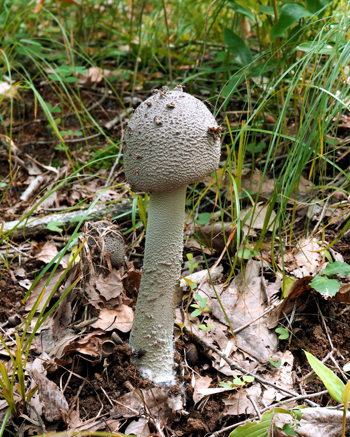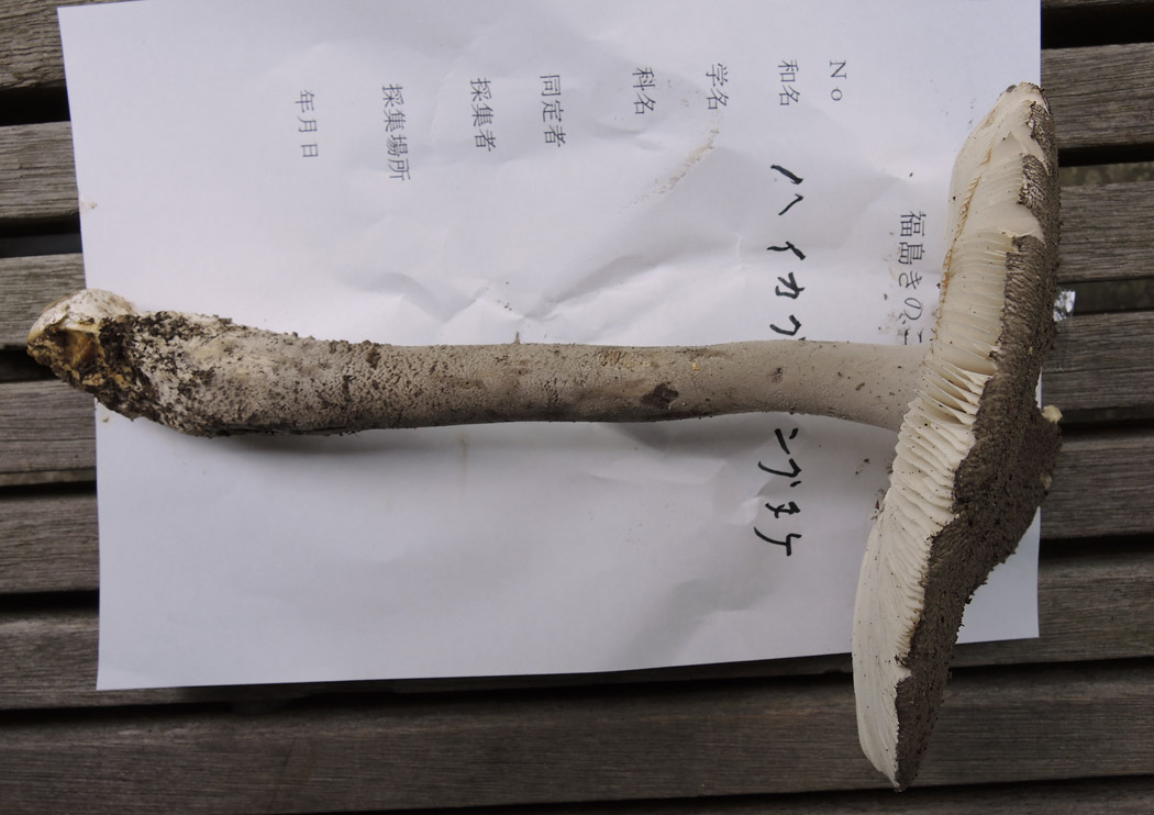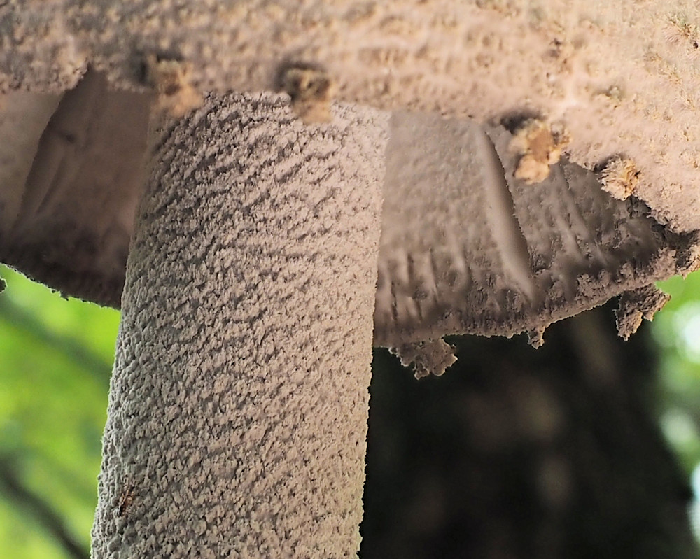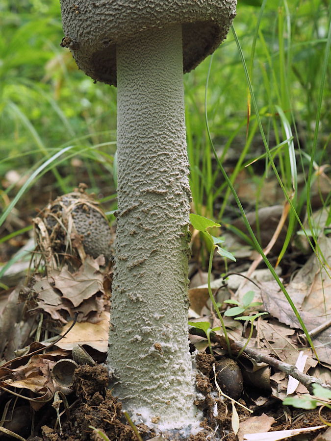 10.0-25.0cm×10.-20mm 上下同径−下方やや太まる 基部の末端は細まる 灰色 脱落しやすい綿くず状のいぼ密生 つぼの区別困難 脱落しやすい灰褐色の早落性の膜質つばあり