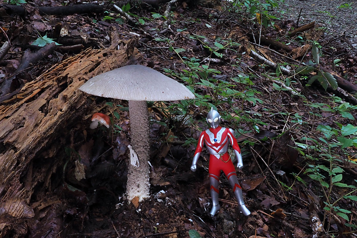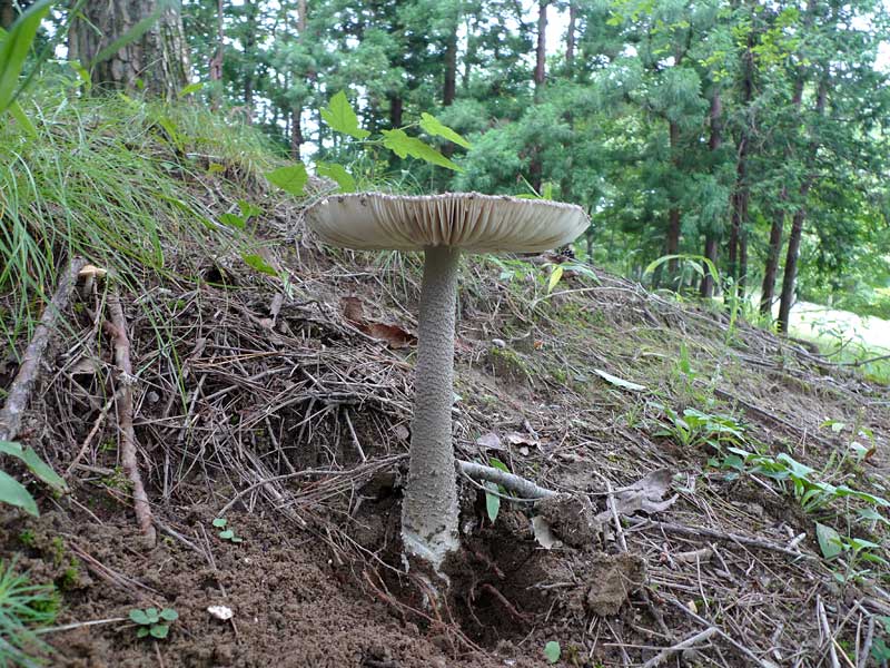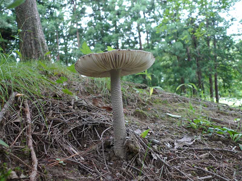 夏〜秋にアカマツの混じった雑木林内地上に発生する