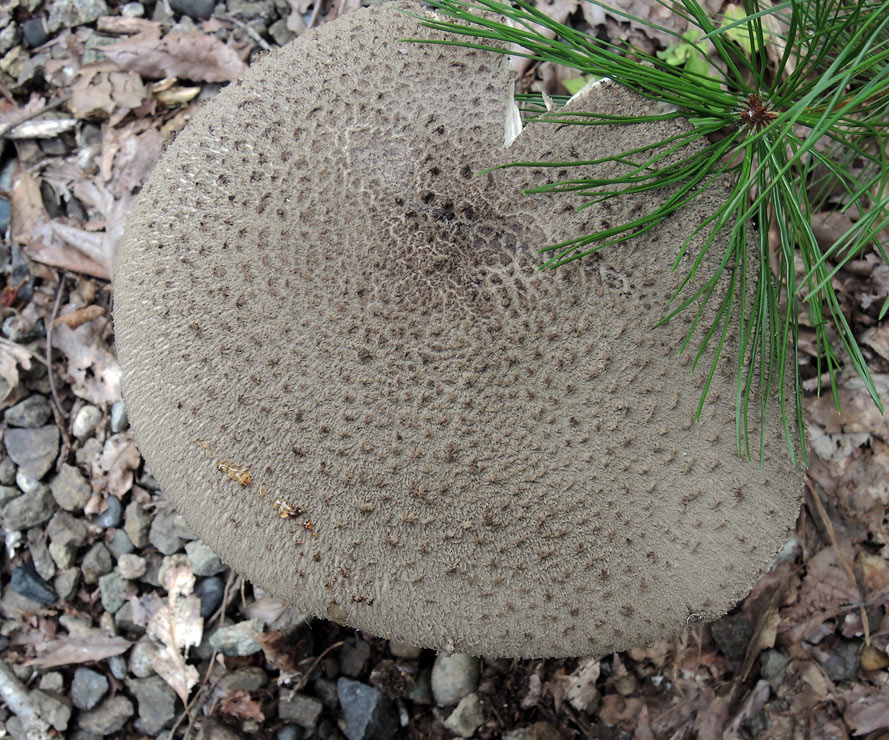 7.0-18.0cm 類球形−円錐状丸山形→平 地色は灰色−白色 灰褐色の粉状−綿くず状いぼ密生→いぼまばらになり溝線明瞭になる ときに縁部に内皮膜破片付着
