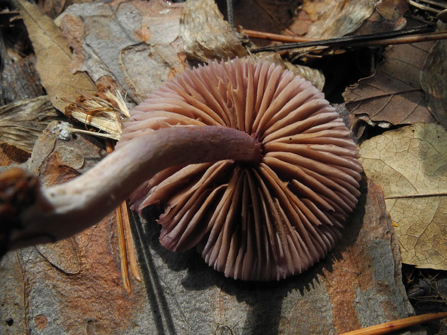 淡青紫色→傘中央と柄基部退色し帯褐色化