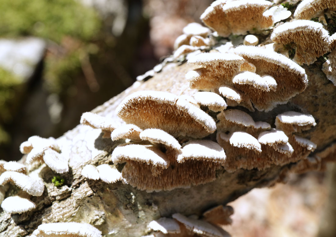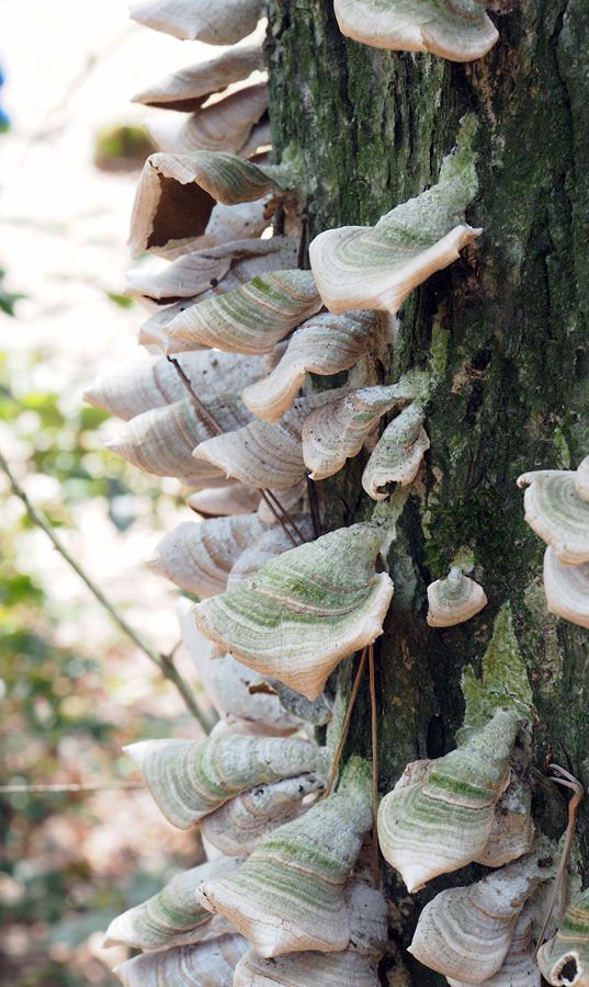 2018年(平成30年)03月14日撮影の子実体は傘上部に緑色が確認されるが、おそらく苔であろうと考えている。
