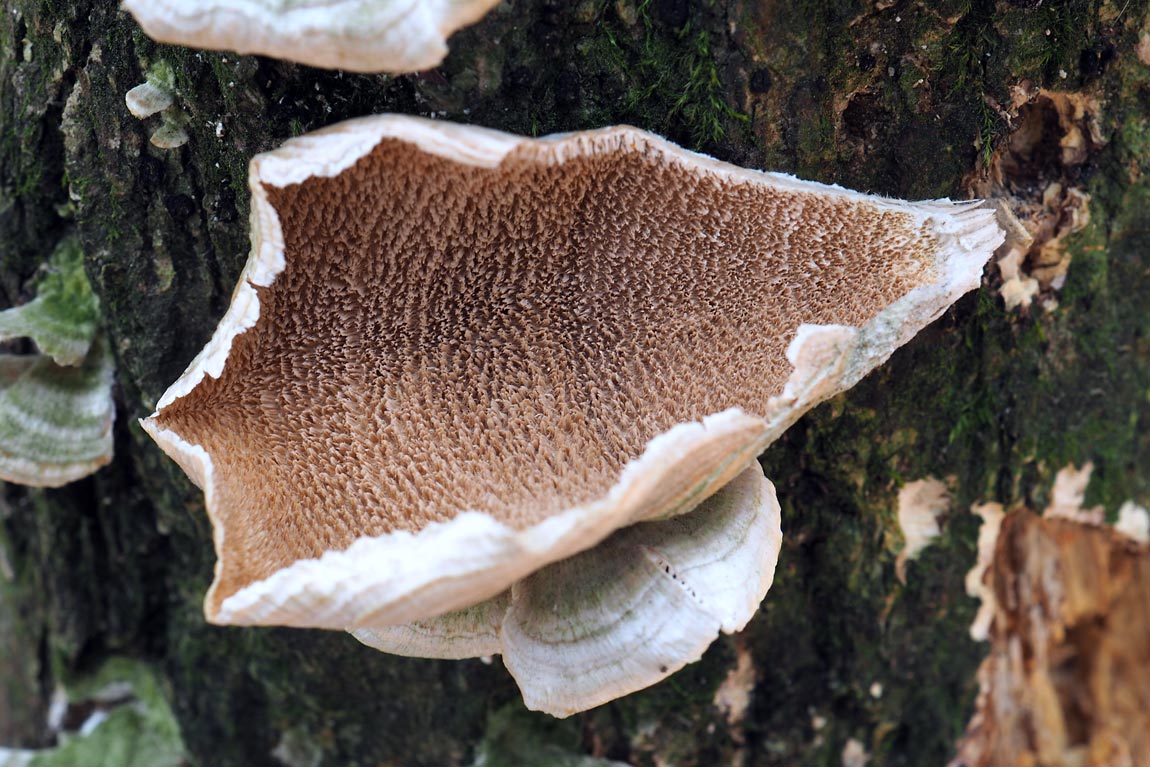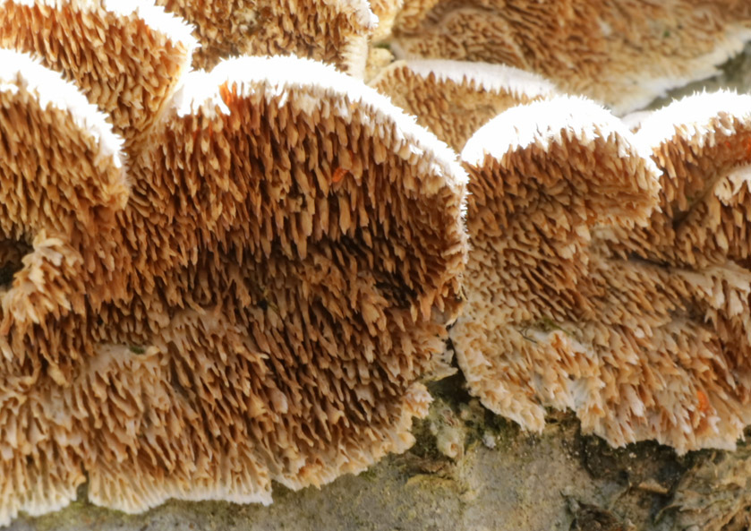 浅い穴形→管孔壁くずれて薄歯状の針のなり密生 淡サクラ色−スミレ色→淡黄色−淡褐色