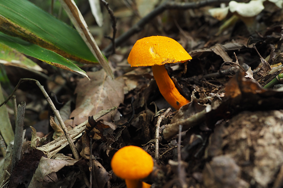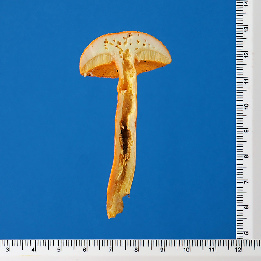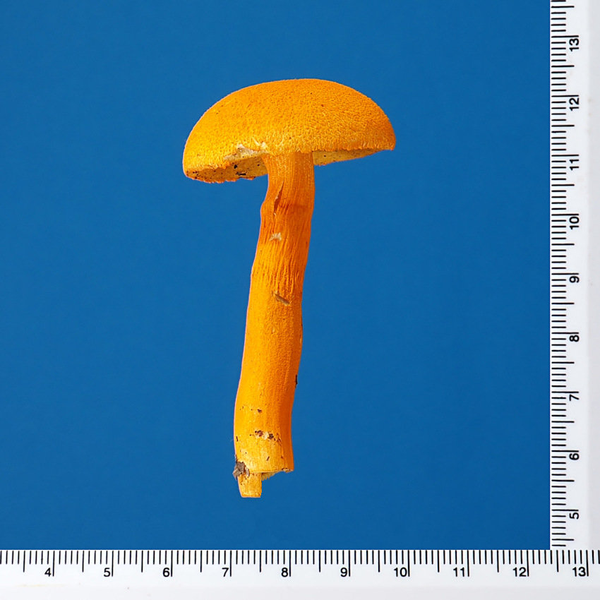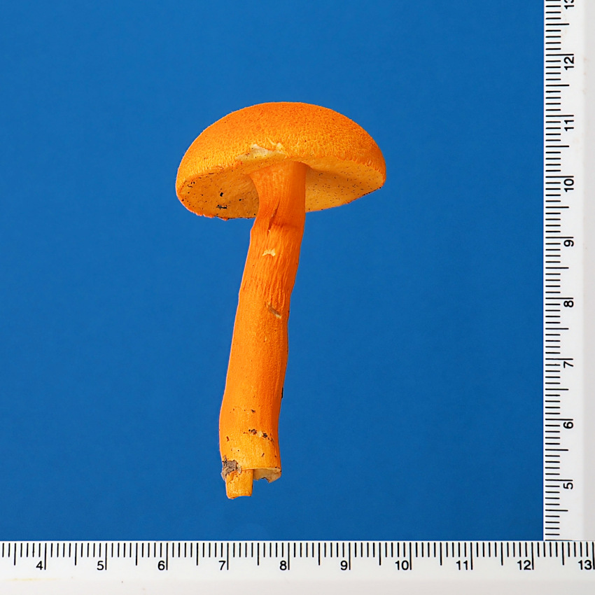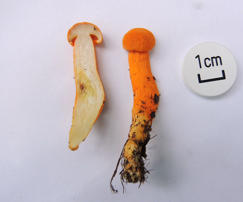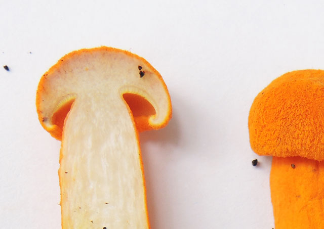 2.0-6.0cm 半球形→饅頭形→平 湿時弱粘性 橙黄色−鮮橙色 鮮橙色のやや粉状−多少綿毛繊維状