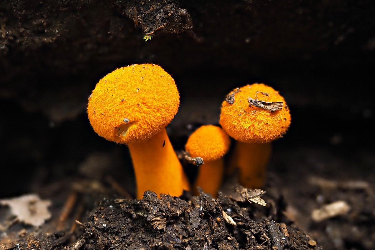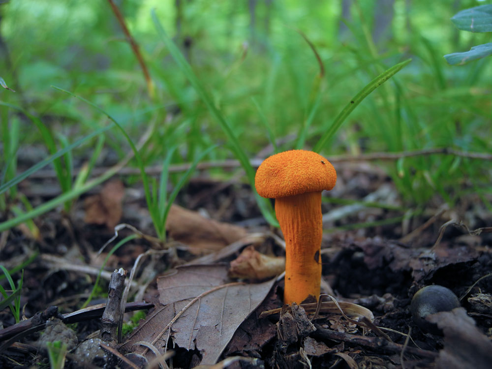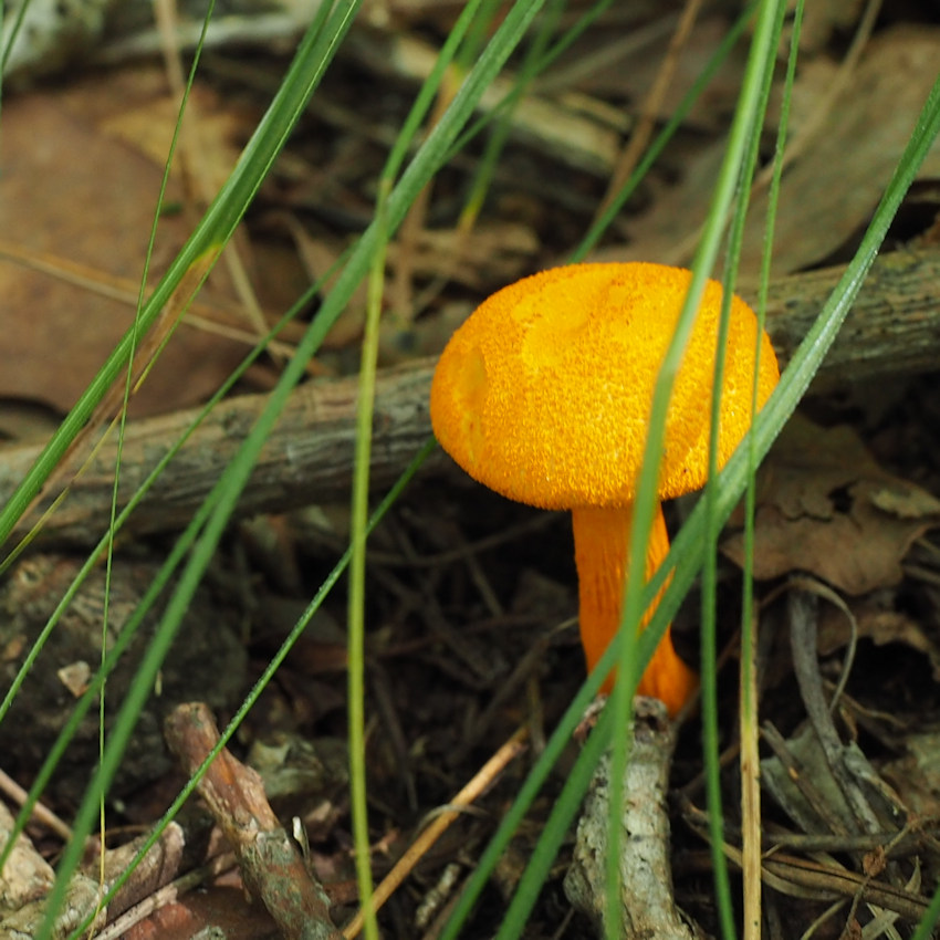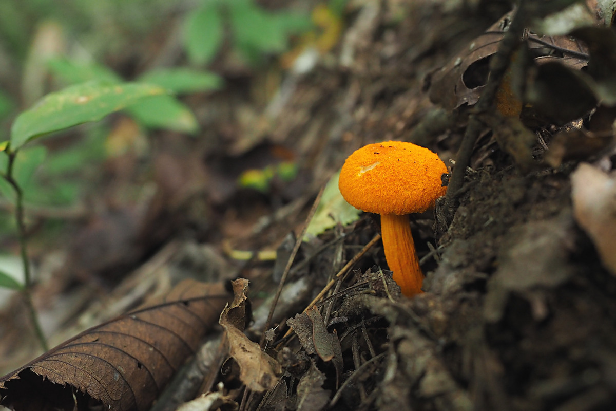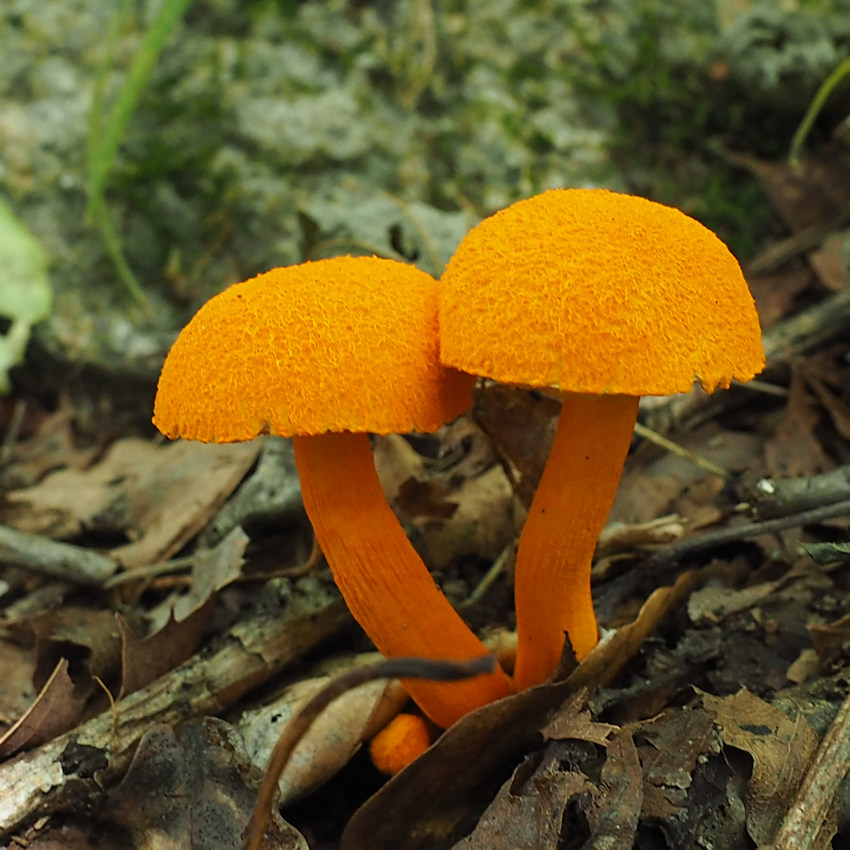 2.0-6.0cm 半球形→饅頭形→平 湿時弱粘性 橙黄色−鮮橙色 鮮橙色のやや粉状−多少綿毛繊維状