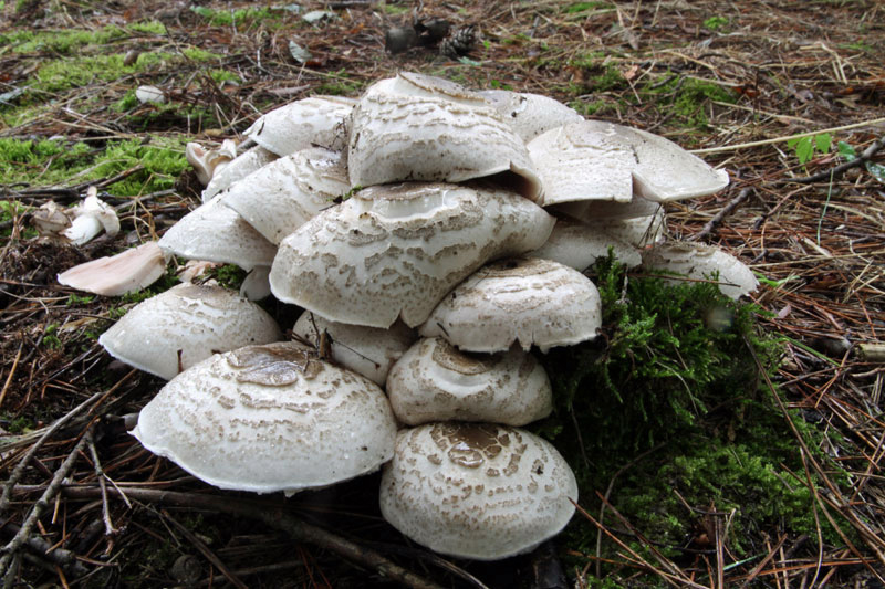 肉が多少とも黄変するもの(または変色しないもの);シロオオハラタケ,オオハラタケ,シロモリノカサ,ウスキモリノカサ、ハラタケモドキ, ナガグロモリノカサ他数種ある。