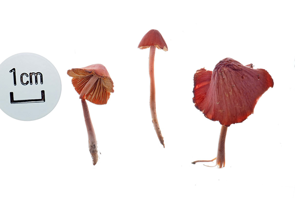 0.6-2.0cm 鐘形→鈍円錐型-やや丸山型 湿時帯ワイン色の赤茶色 乾燥で淡色になる 湿時条線を表す