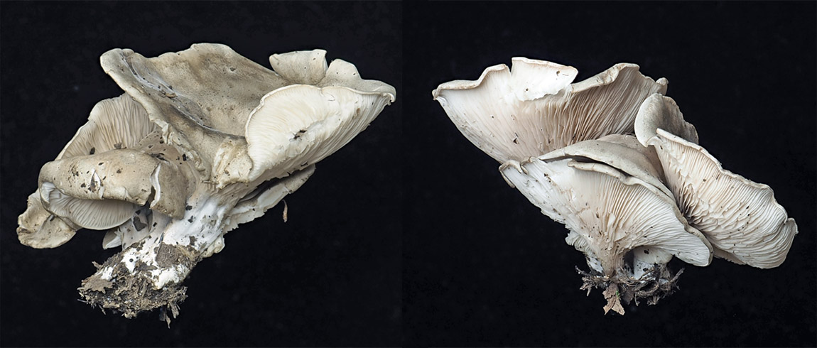 径3.0-9.0p まんじゅう形→平ら→皿状に反り返る 湿時粘性あり 灰白色−濃灰白色 微粉状 縁部は初め内側に巻く