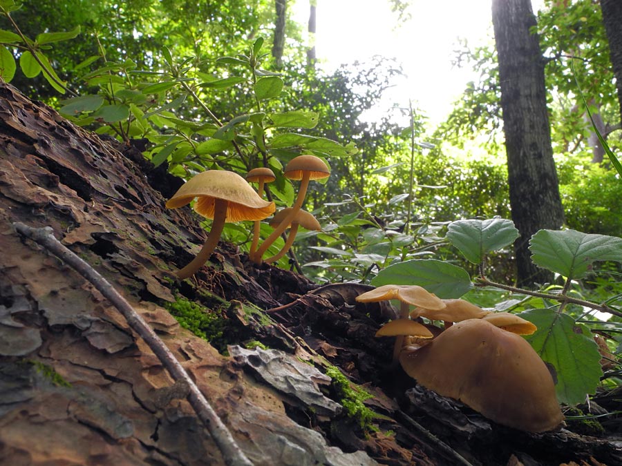 夏〜秋に林内針葉樹(特にマツ)下の腐植上−古い切株に発生する