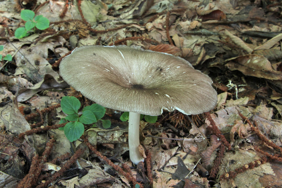 径5.0-15.0cm 半球形→まんじゅう型→平ら→中央部くぼむ平ら 灰色−灰褐色−黒褐色など 灰褐色で放射状の繊維紋を表す