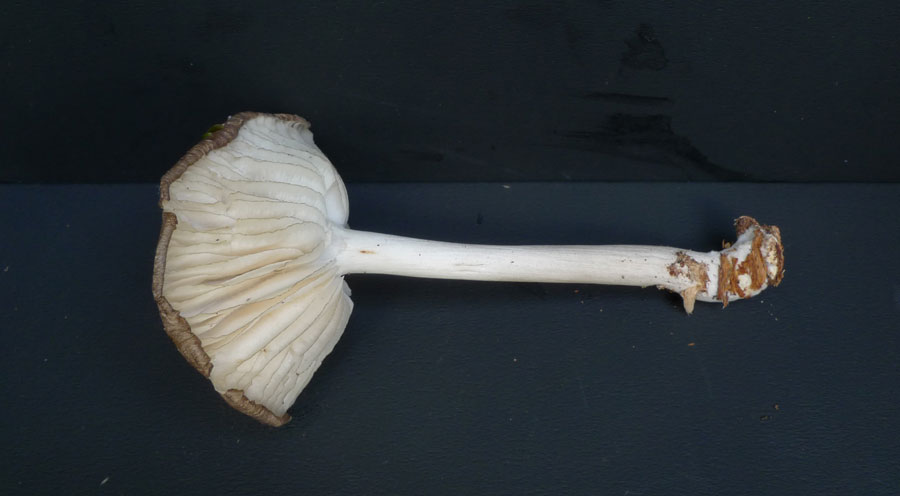 7.0-12.0cm×10-20mm 上下同径 白色−傘より淡色 上部で堅く繊維状 条線あり 上部は粉状 根元に白色糸状-ひも状の菌糸束あり 中実−中空