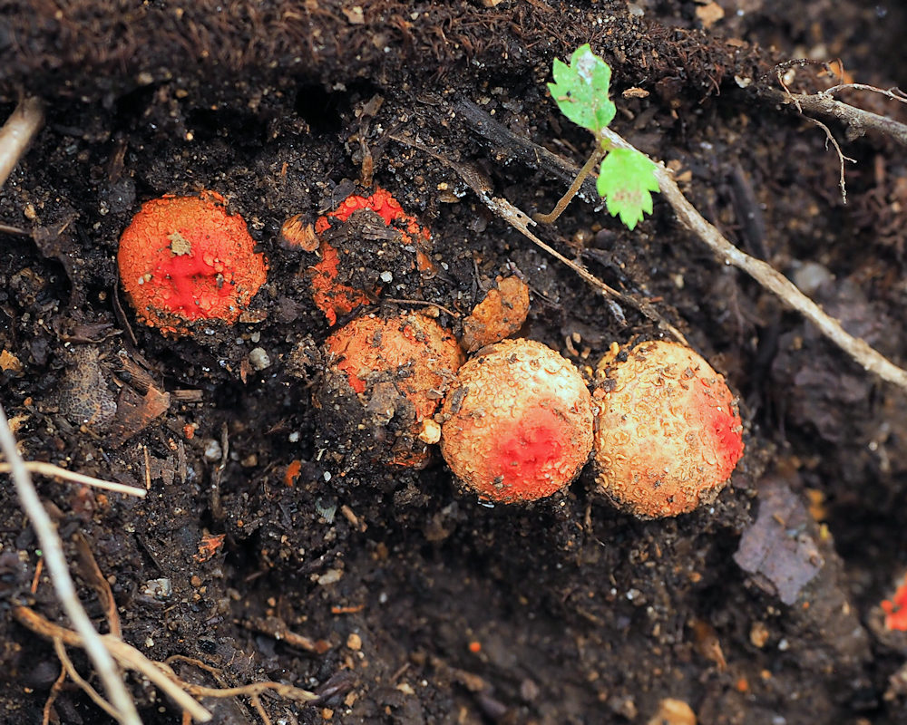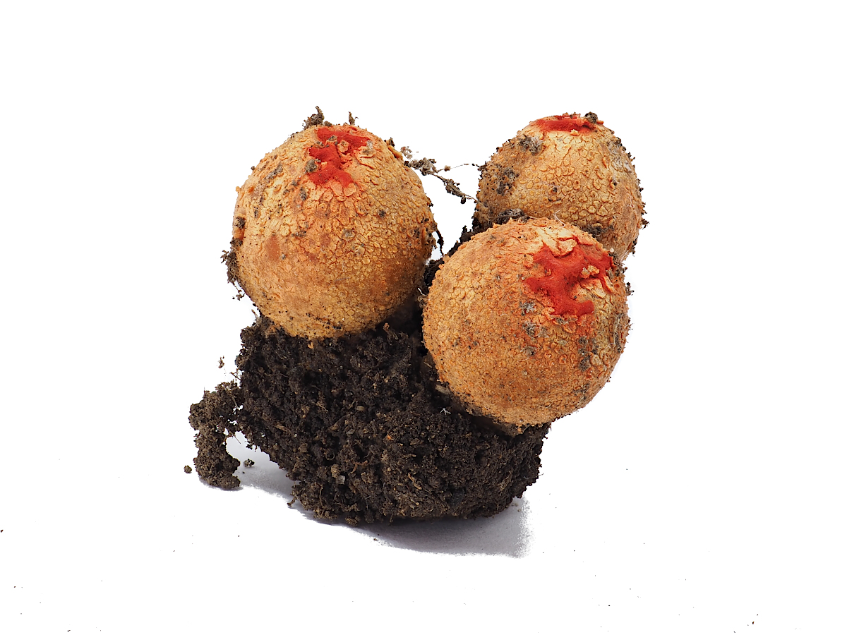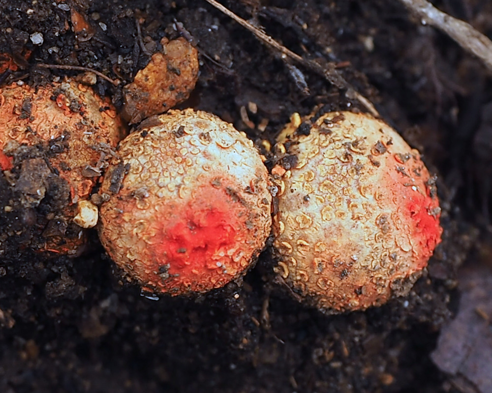 頭部は0.5-1.5p 淡紅色 表面にささくれ−点々と破片付着 頂部にはやや星状の裂口あり 裂口の縁は鮮紅色