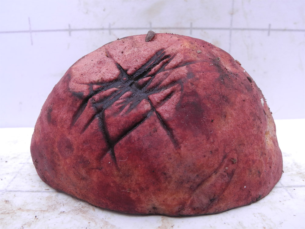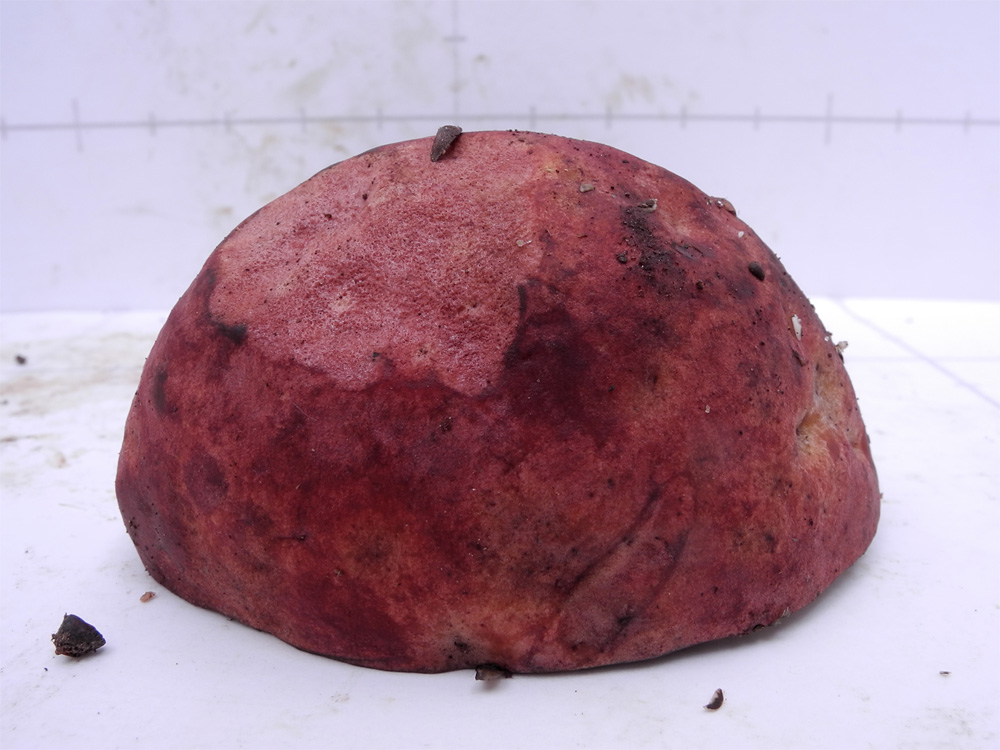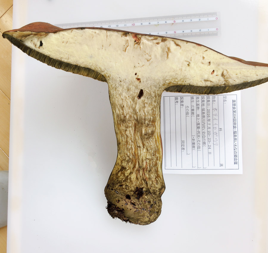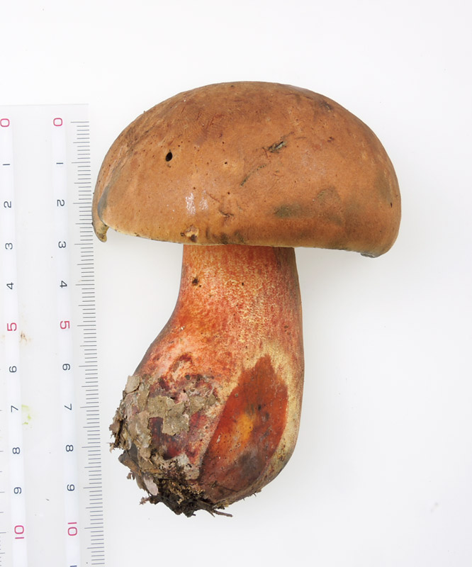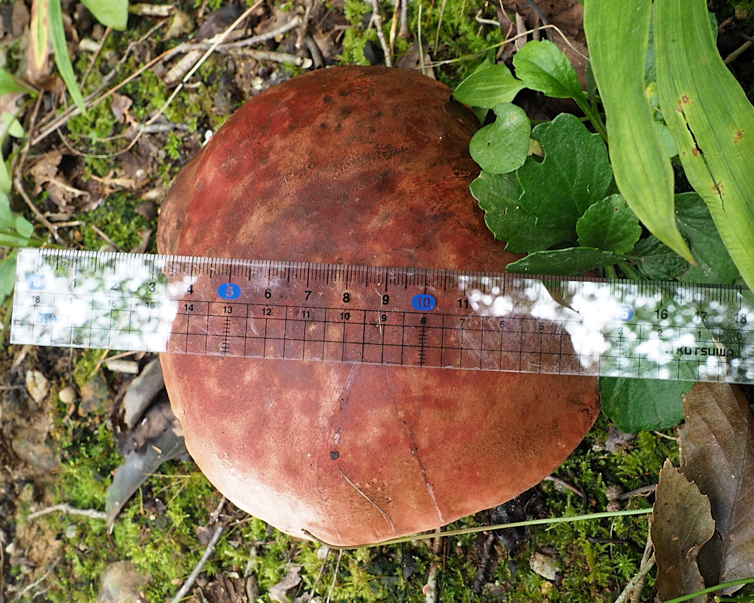 9.0-18.0cm 半球形→饅頭型→平ら−周辺反り返った平ら 周辺部幼時内巻き 乾性 湿時弱粘性 赤褐色−帯黄褐色−褐色 擦ると速やかに青黒く変色
