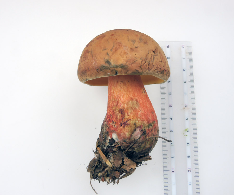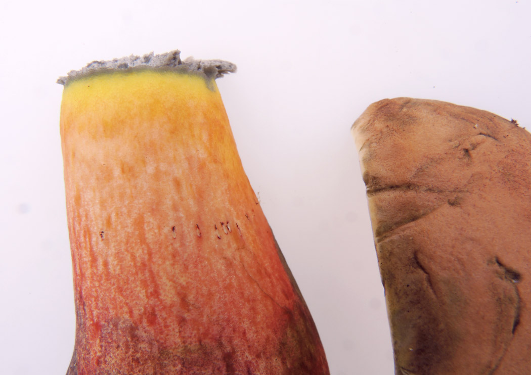 6.0-17.5cm×24-50 mm 便腹状-ときに下方に向かって太まりる−下部が著しく膨らむ 中実 黄色−帯橙黄色 頂部に網目−下方に向かい不鮮明 網目の色は頂部黄色−下方へ向い橙色−下部帯赤褐色の細粒点に覆われる 擦ると速やかに強く青変する 基部は黄白色の菌糸体に覆われる