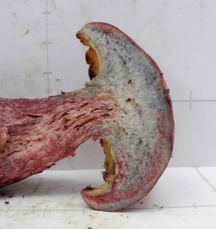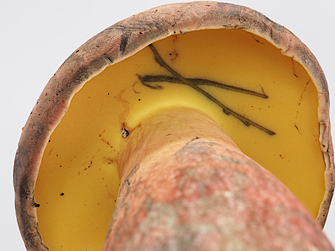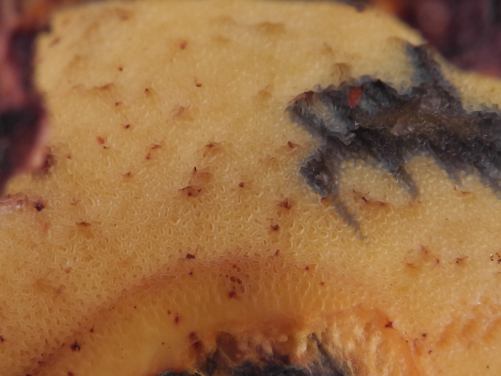 黄色→帯緑黄色→帯橙色 傷つくと即強青変する 幼時垂生状直生−柄周囲で浅く陥入 長さ2-4mm-老成したものは6mm程度 孔口は長円形−類円形 管孔と同色 傷つくとと速強青変