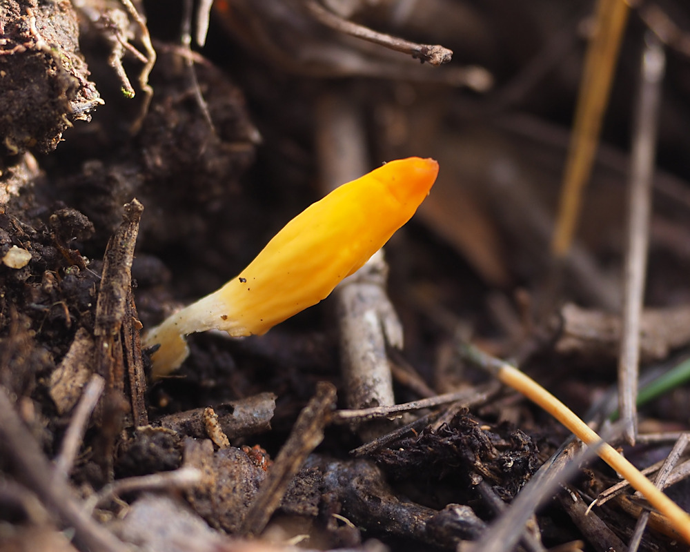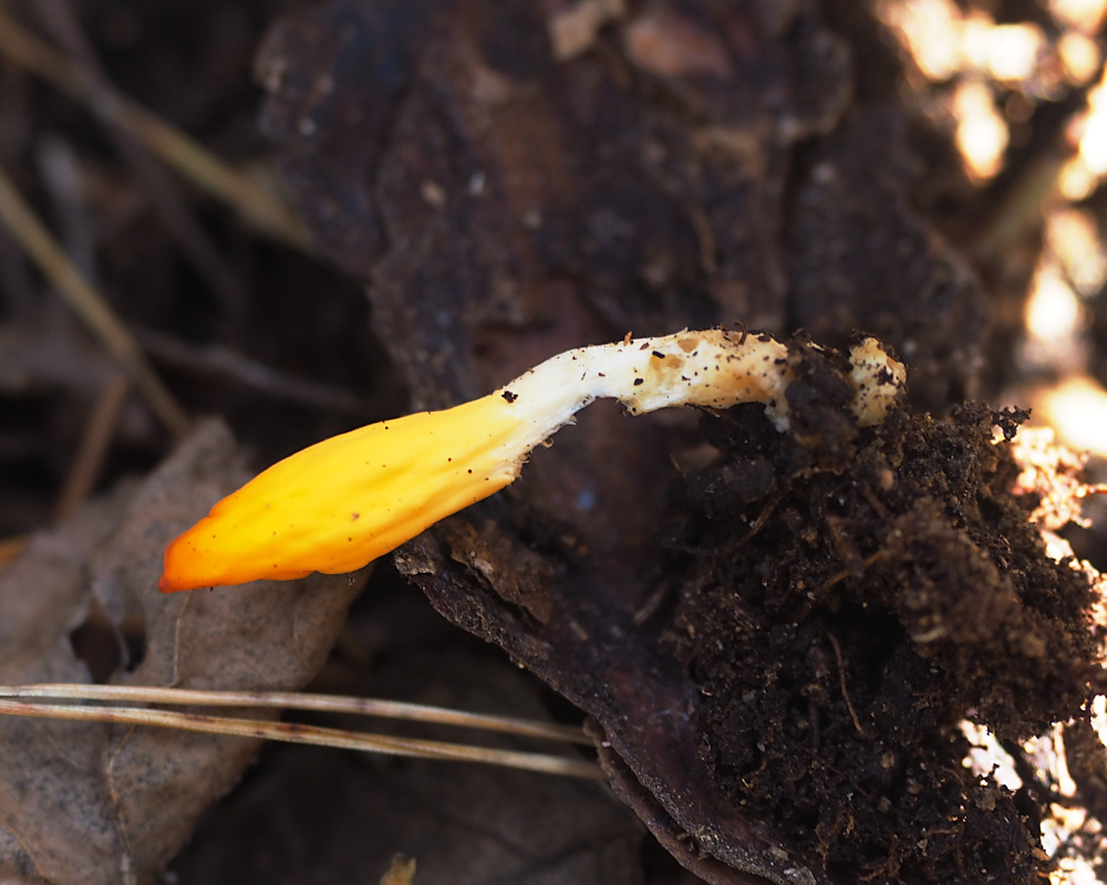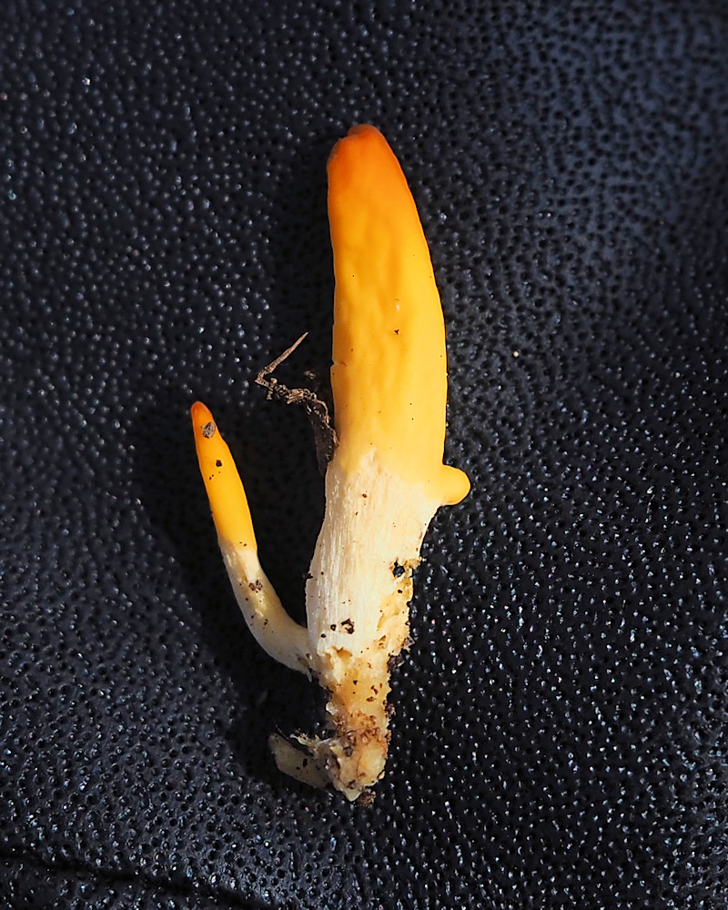 高さ3.0-10.0cm へら状−舌状−ときに切れ込みあり 基部は細く柄状−基部は白い柄状 柄を除いて鮮黄色−卵黄色