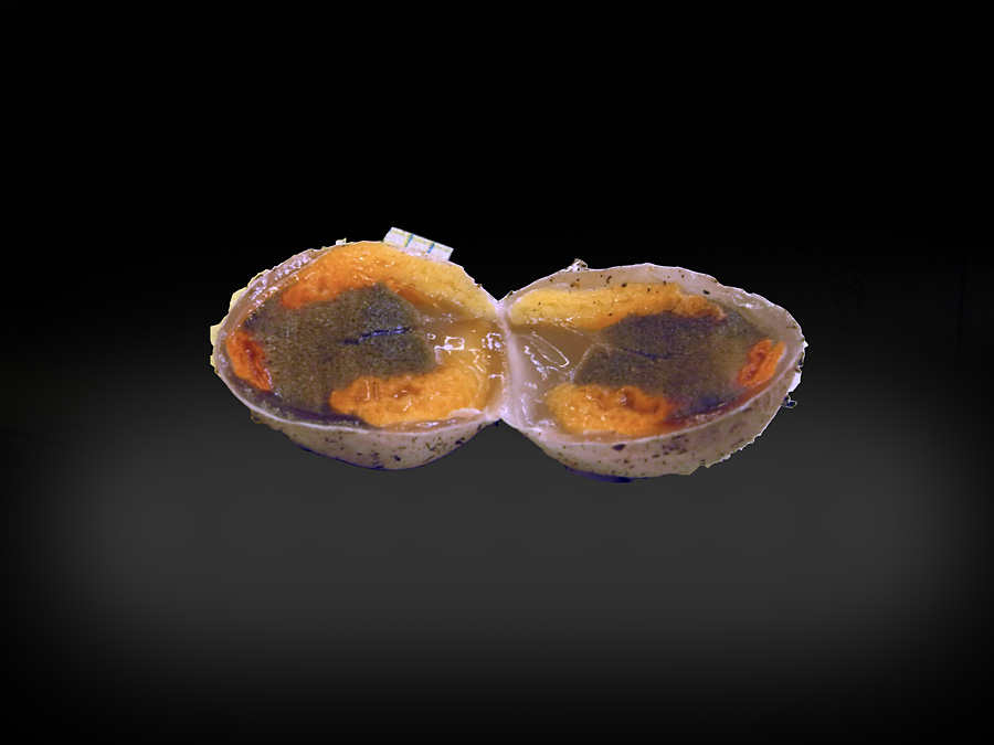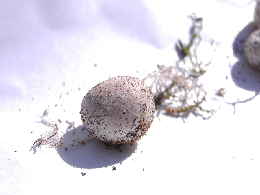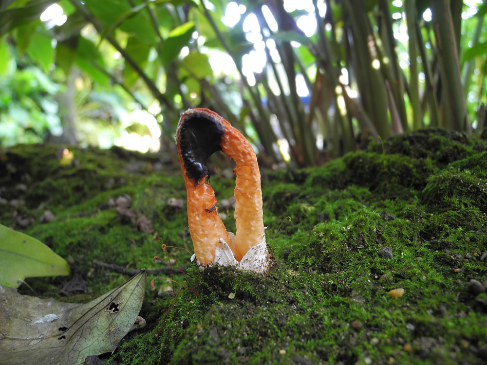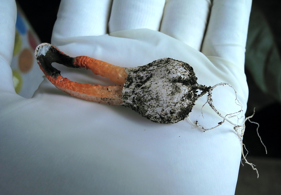 採取地; 腐植多い地面 子実体; 幼時径1.5p前後 白色 卵形−球形 成熟し殻を破り2本の宅を伸長 高さ6.0p前後 無柄で上部細まる 中間部が外側に湾曲 上位淡橙黄色−淡紅色 下方ほど淡い 托上部内側に暗緑色−暗緑褐色粘液の基本体付着 糞臭発する