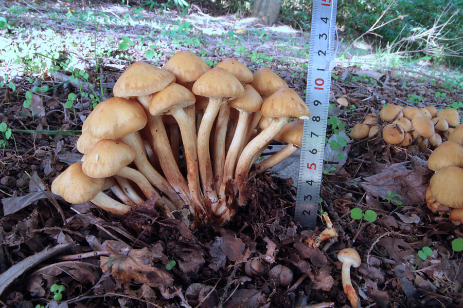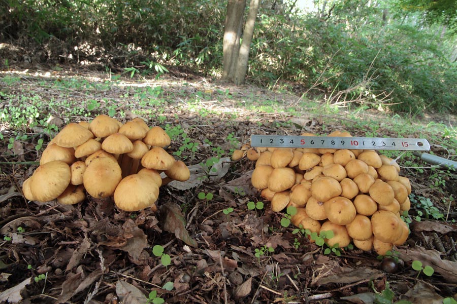 初夏〜秋に広葉樹−アカマツの根際や木周辺および埋もれ木に発生する