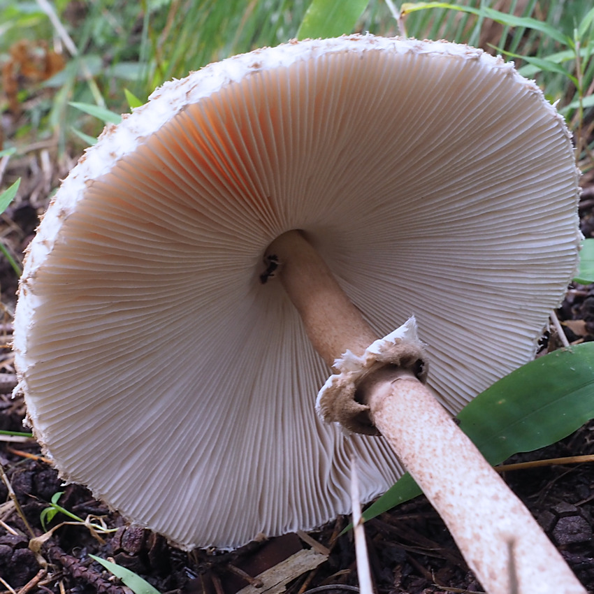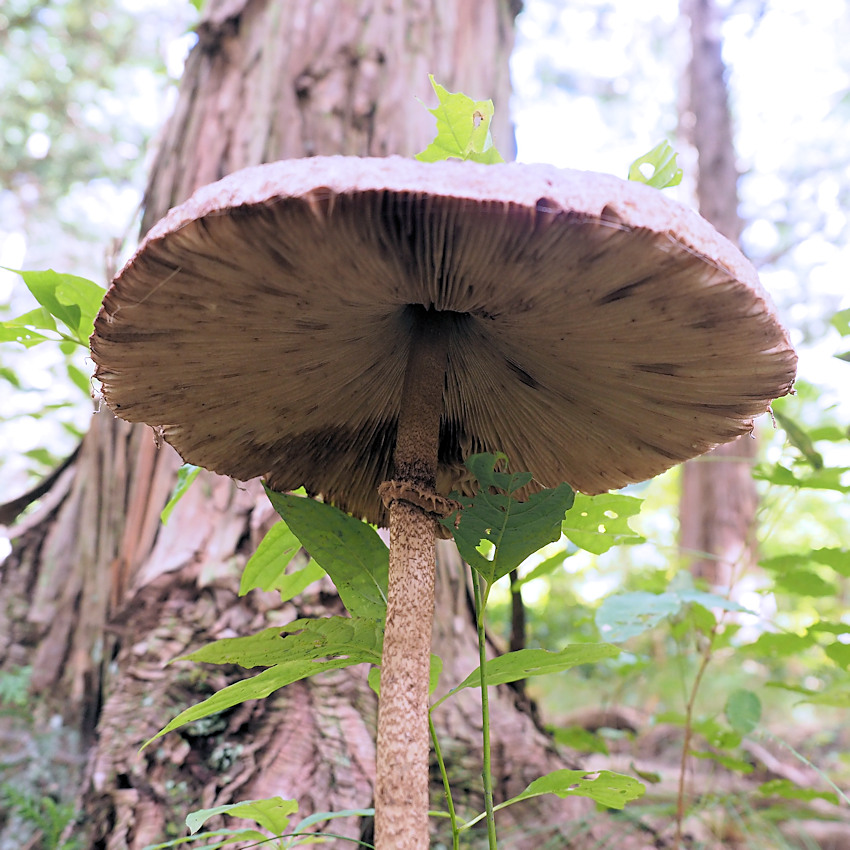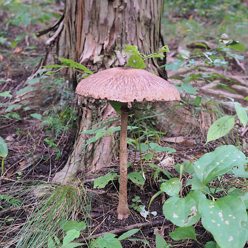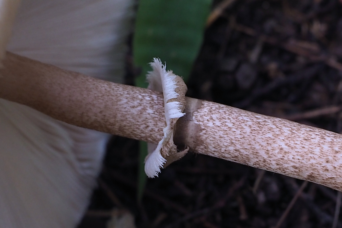 15.0-30.0cm×12-20mm 灰褐色の細かい鱗片を帯び多少だんだら模様をなす 中空 +基部は著しく膨らむ つばは+厚い +上面は白色 +仮面は灰褐色 +可動的である