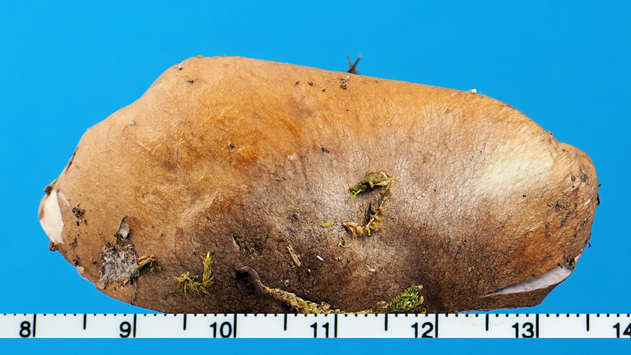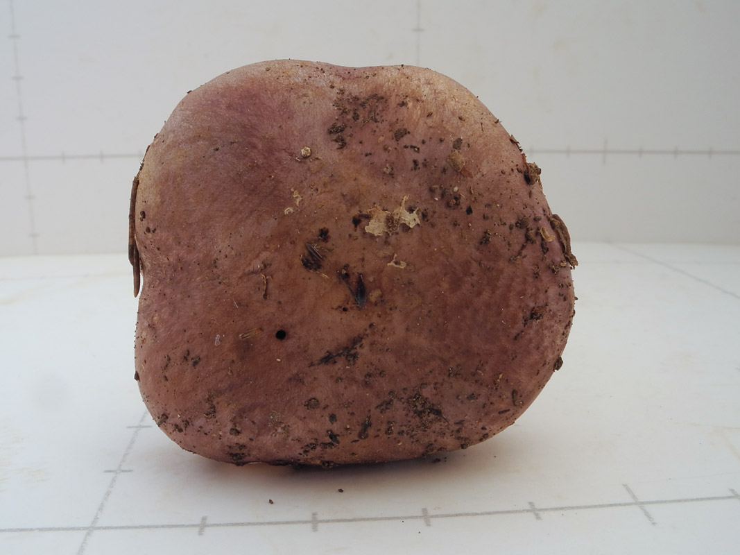 3.0-15.0cm 饅頭形→平 湿時粘性 縁部内巻き フジ色地に褐色繊維密着−表面繊維状 中央部は褐色−帯紫灰褐色−茶褐色−黄土褐色 周辺部は淡色で紫色帯びる ときにクモの巣状外被膜付着