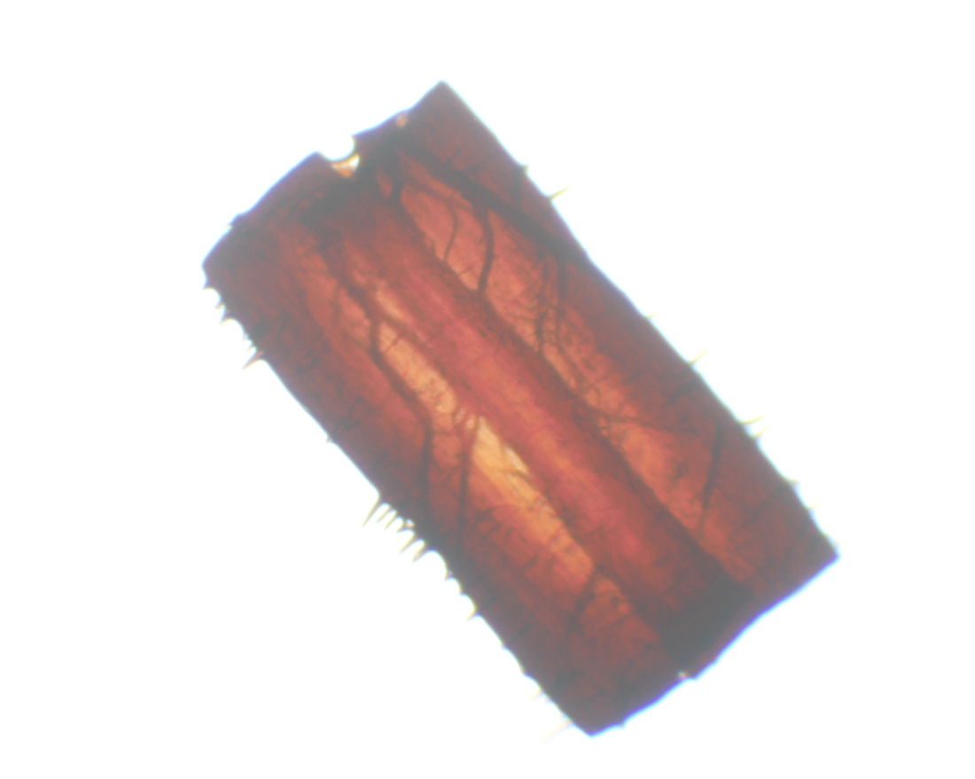 長さ20-50mm×径0.2‐0.5mm 全体が黒褐色だが、ときに頂部付近は淡黄土色 ほとんど上下同径で円筒形 短い白毛密生 脆い