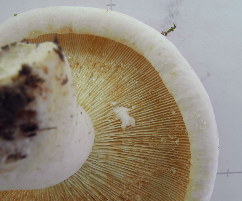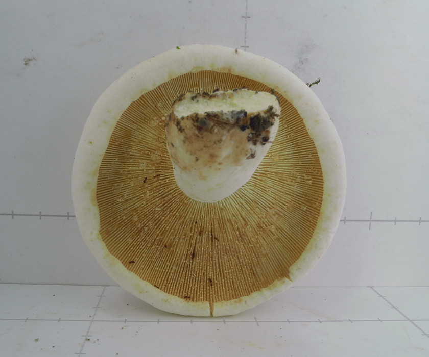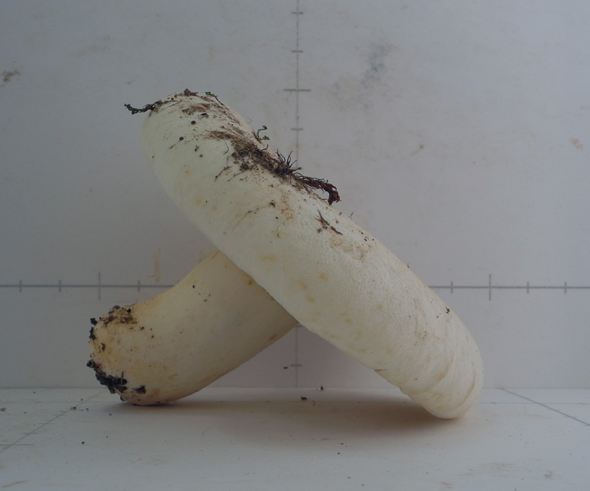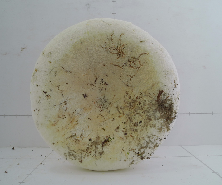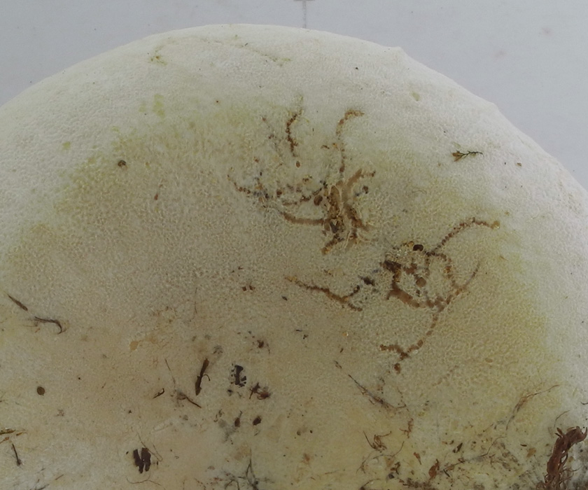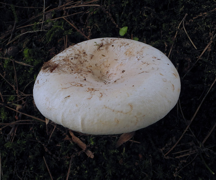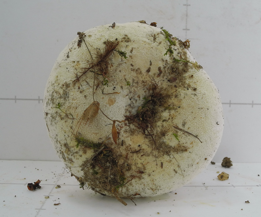 8.0-15.0cm 中央くぼんだ饅頭形→中央窪む平ら→じょうご形 表面は微毛に覆われビロード状 粘性無し 白色→帯黄色−帯褐色の汚班生じる 縁部初め強く内に巻く