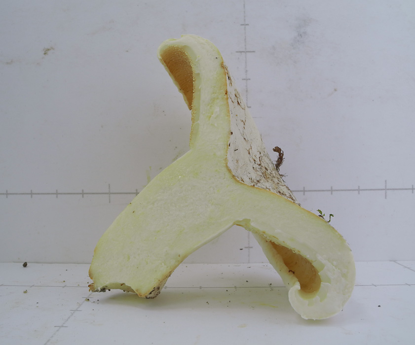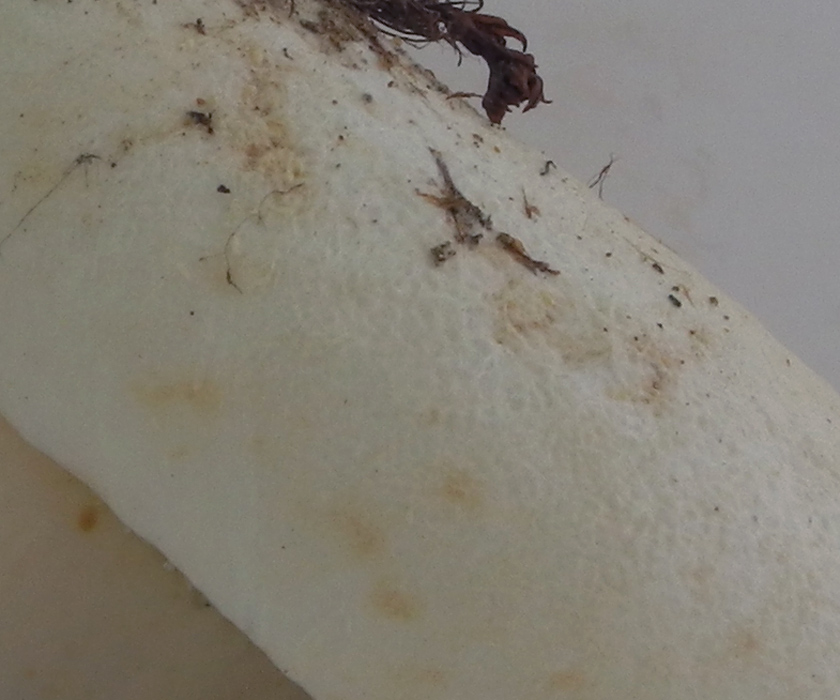 3.0-4.5cm×20mm前後 太短い 白色で一部淡黄色 ビロード状 中実−中心部海綿状