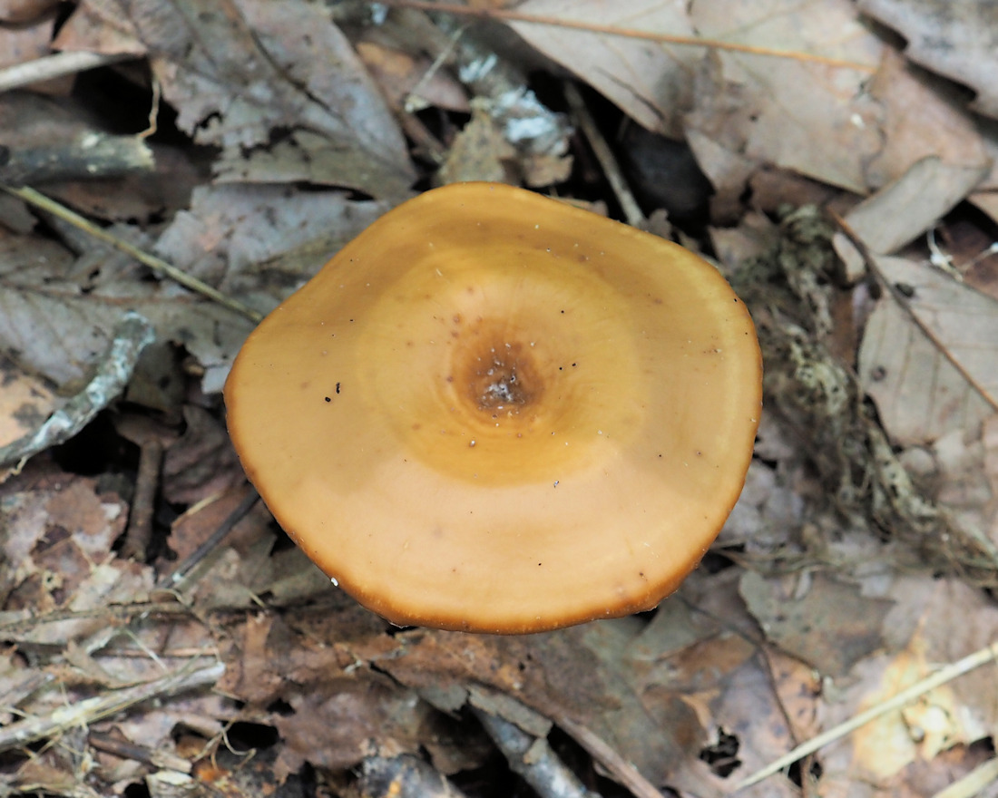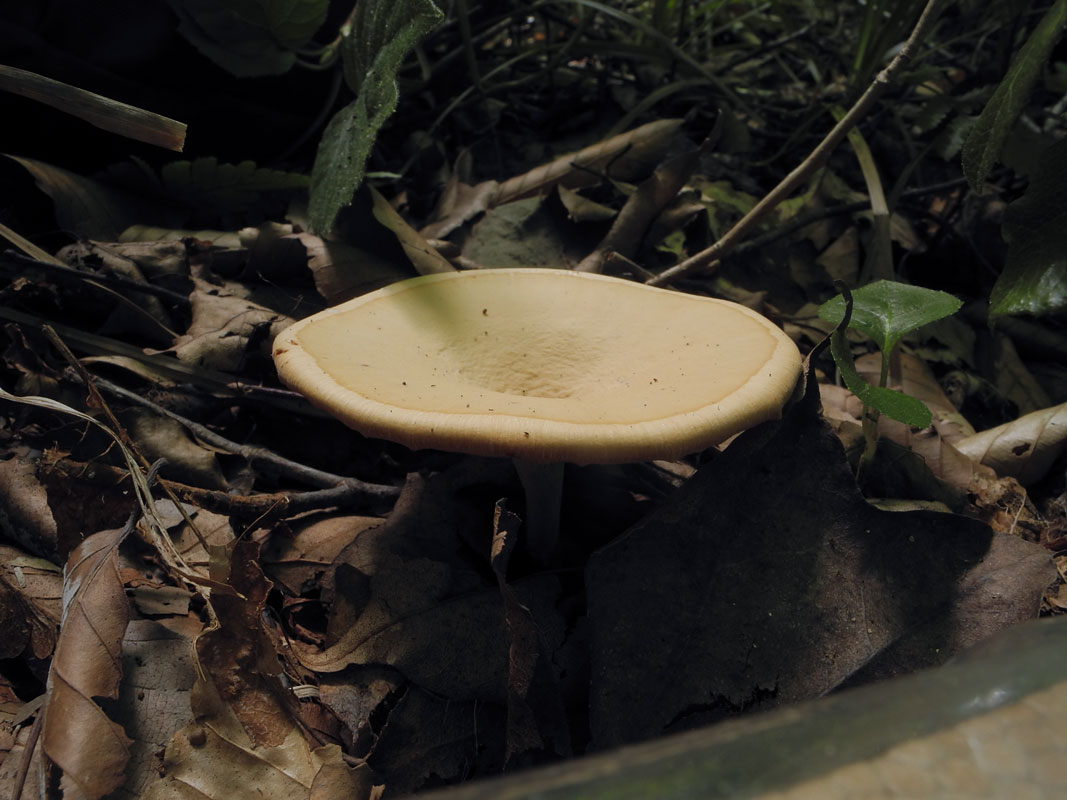 径3.0-8.0cm 厚さ2-4mm 円形−腎臓形−扇形などで、柄のつく位置により変化する 柄が中心生の場合は円形で中央くぼんだ浅い漏斗形 黄橙色−黄土色 無毛平滑 放射状に走る微かな繊維紋おびる