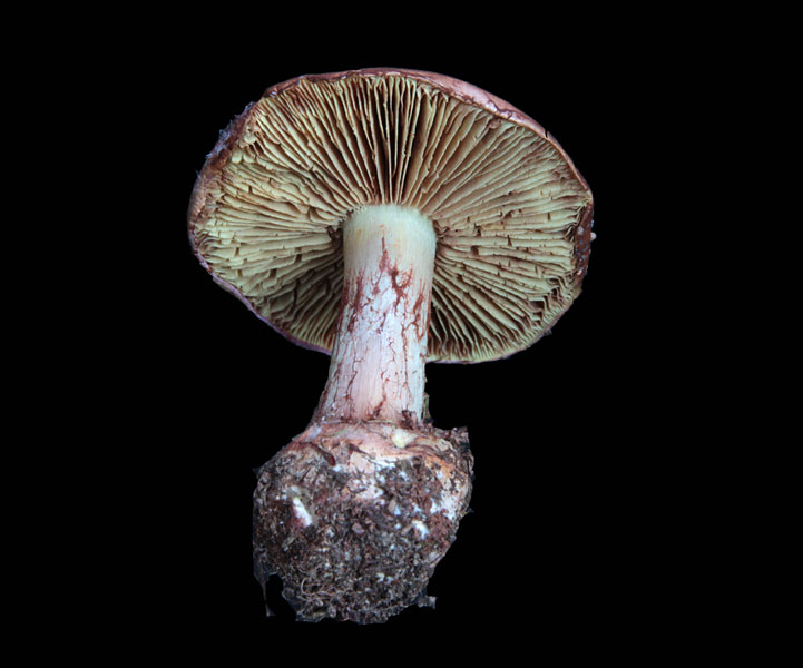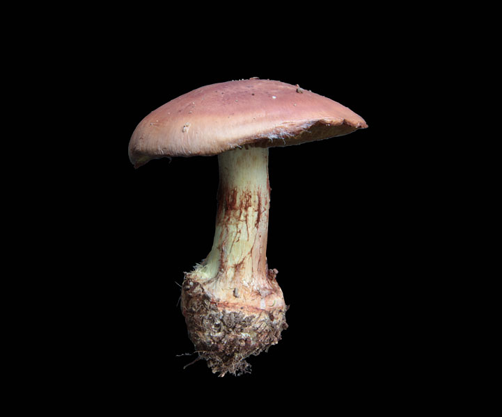 やや逆こん棒形 基部塊茎状 帯オリーブ淡黄色 繊維状 内皮膜は淡黄色 粘性なし 中実