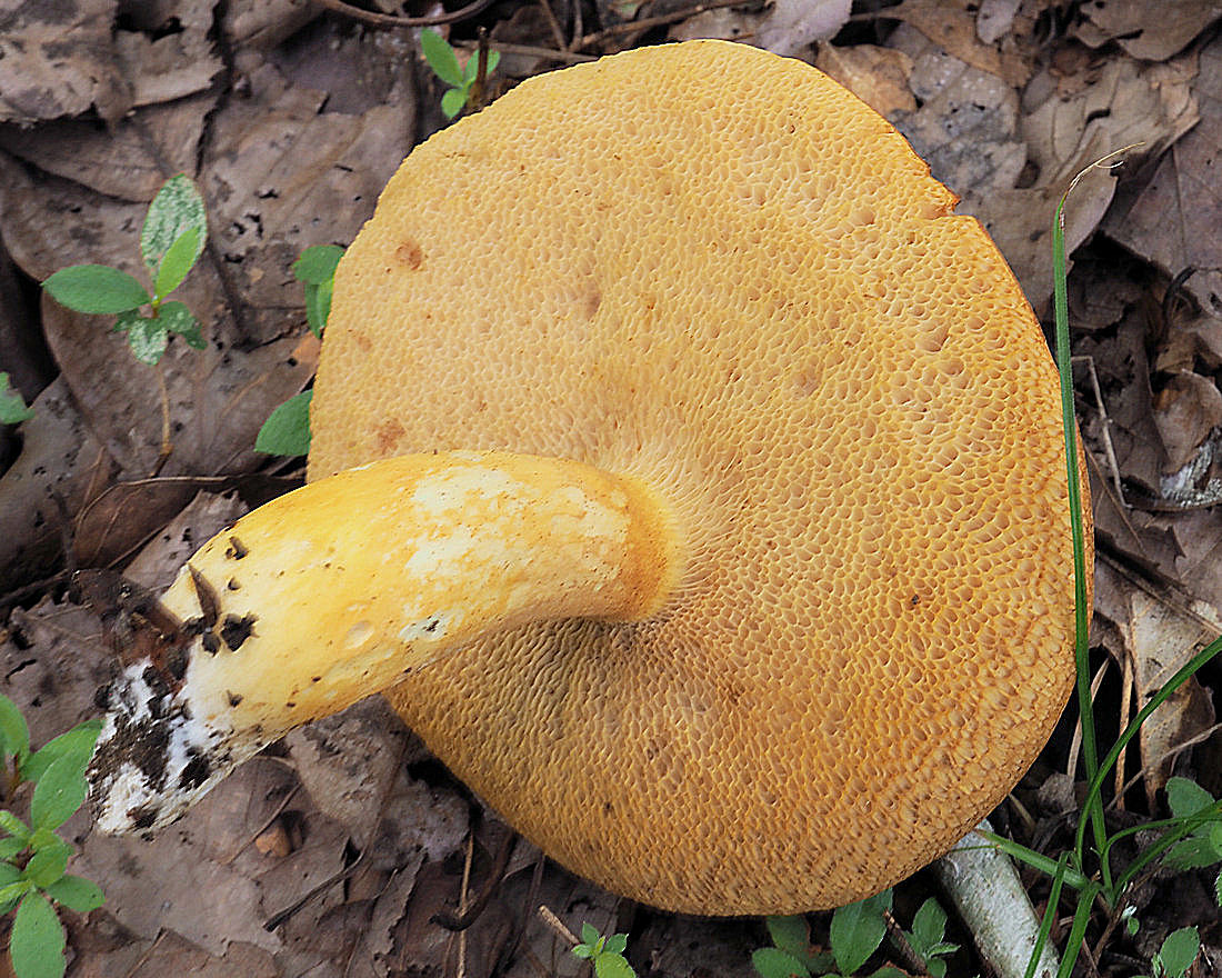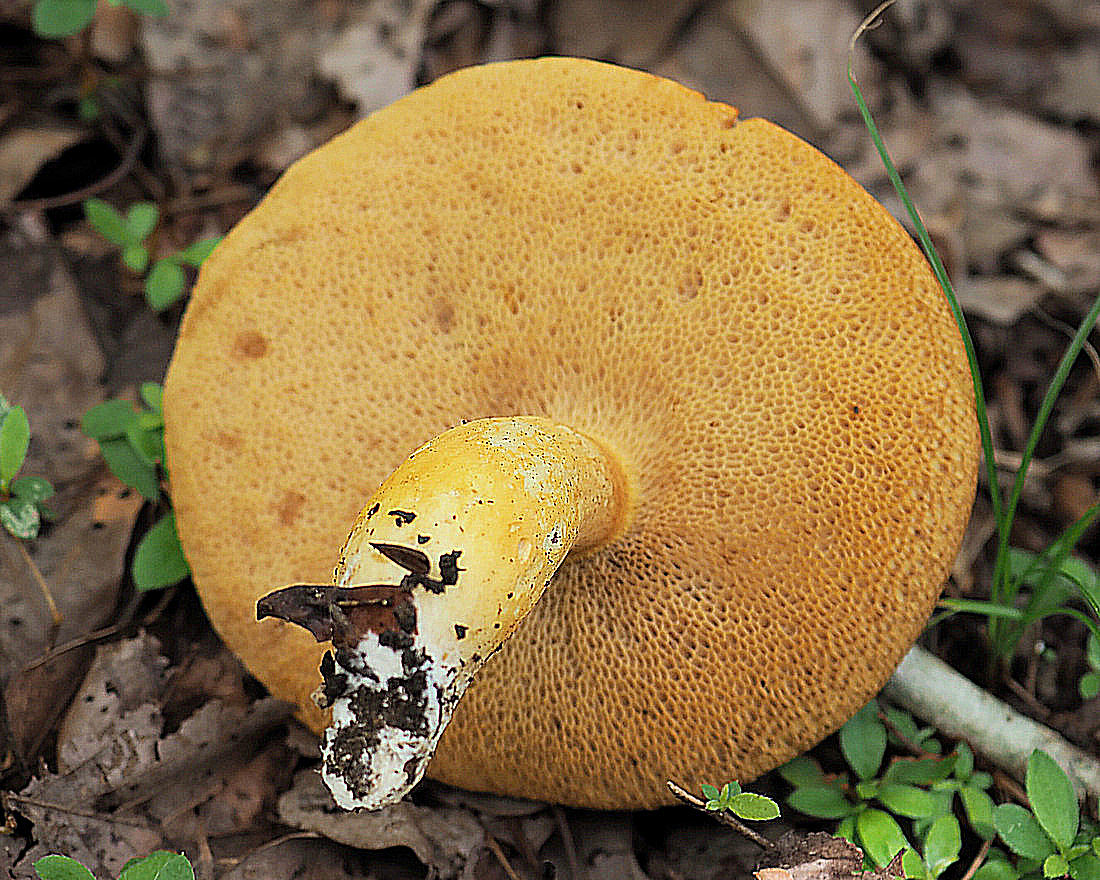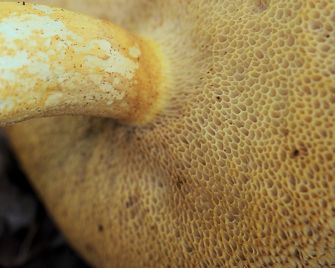 傘肉は類白色で表皮下は帯黄白色 傷つくと淡紅色→帯緑黄色に変化 苦味なし 柄の肉質は硬い