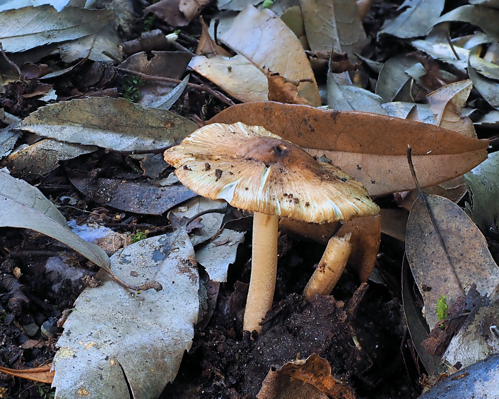 2.0-4.5cm 円錐形→中高扁平(中央部が高く突出) 黄土色−帯褐黄土色 帯褐黄土色繊維に覆われる 成熟につれ表皮は放射状、繊維状に細裂し白い地肌表出
