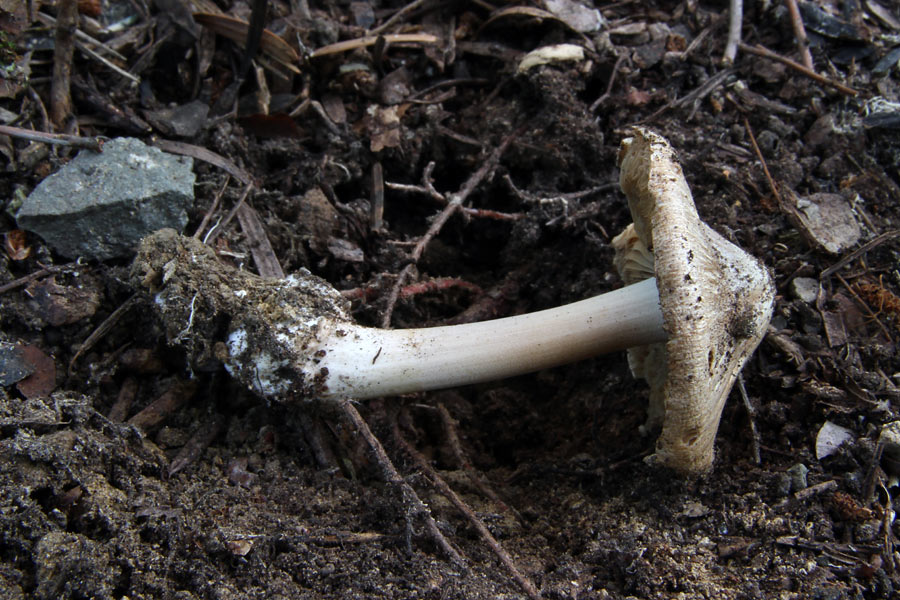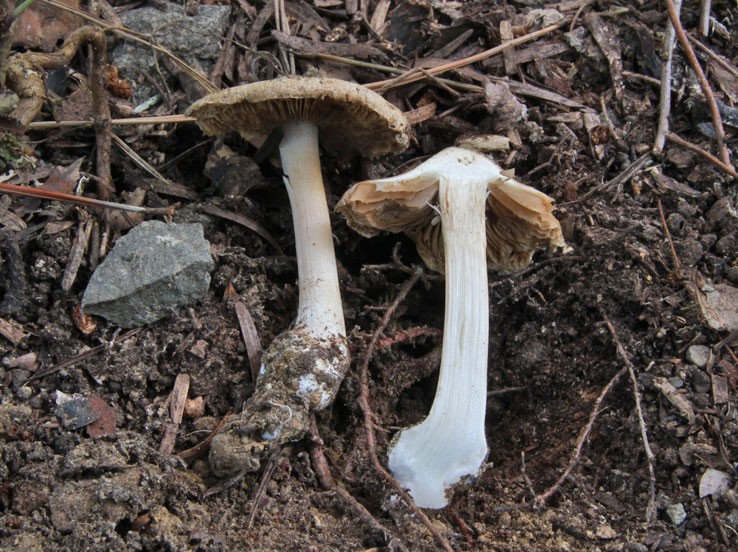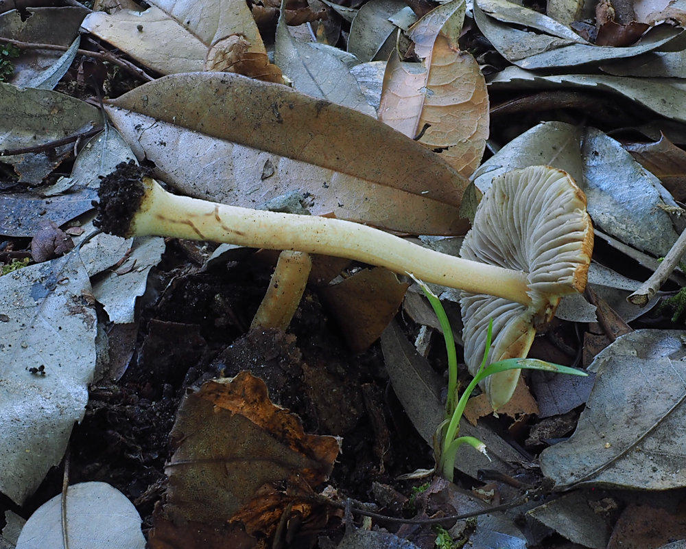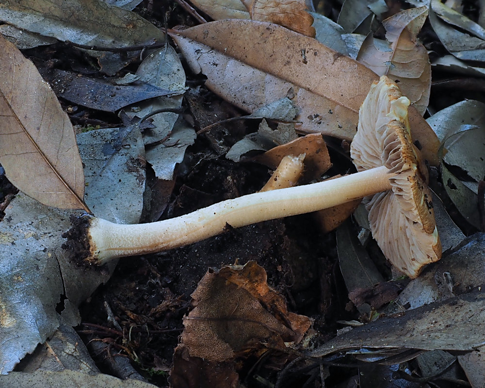 2.0-6.0cm×2-5mm 上下同径 基部球根状−やや球根状 淡黄土色 繊維状 基部に白色菌糸まとう 中実