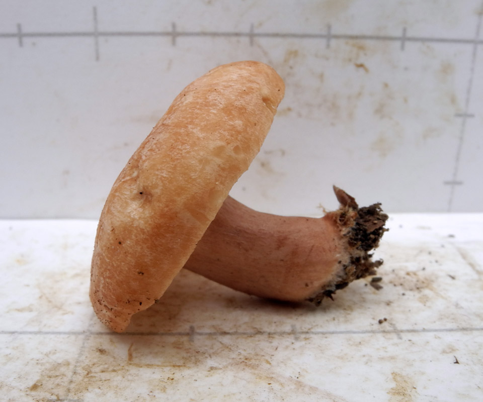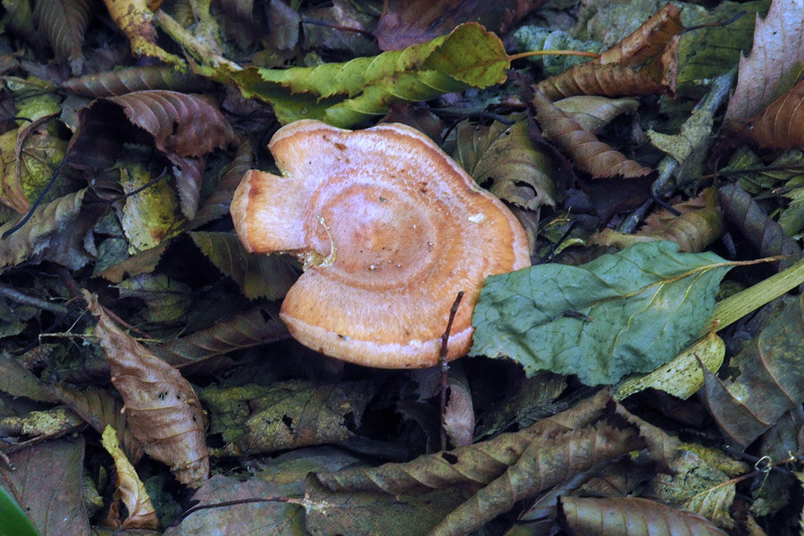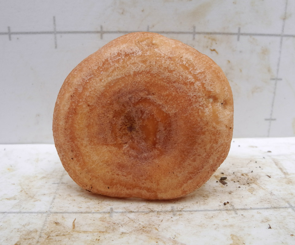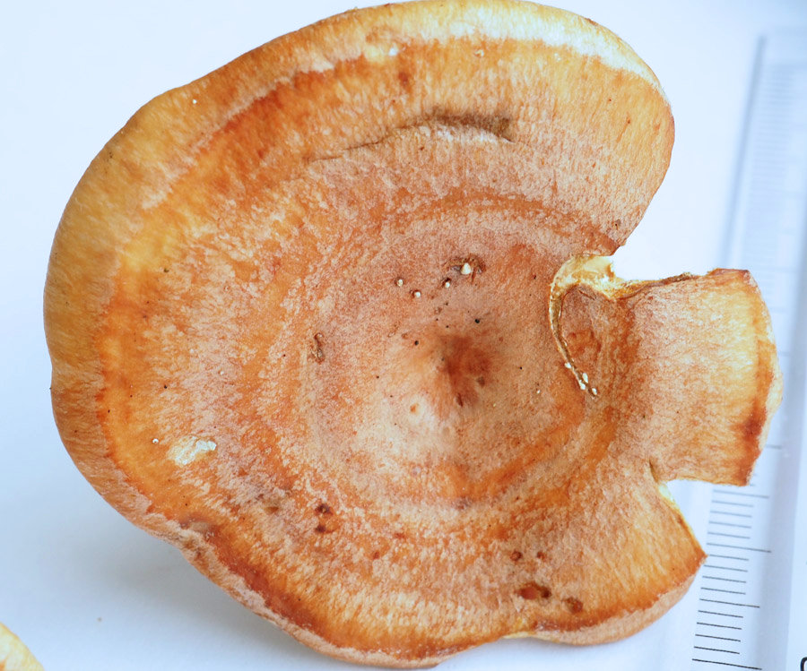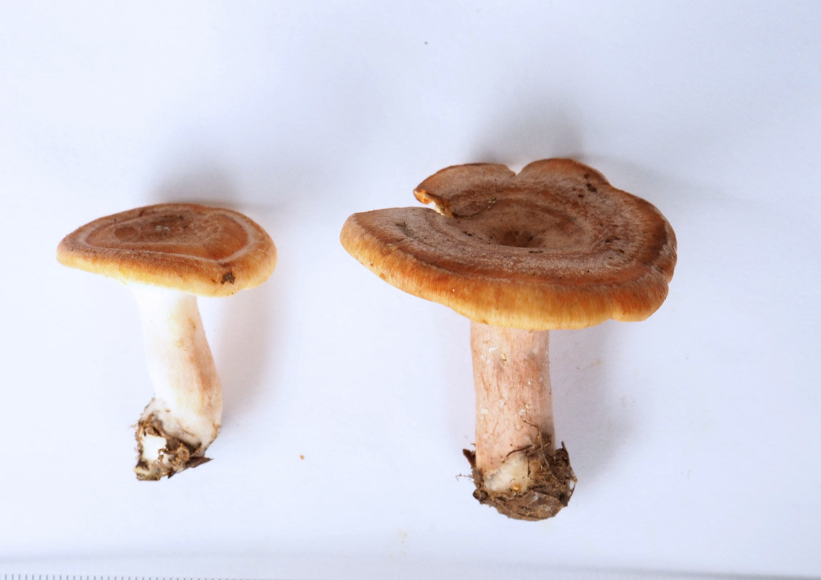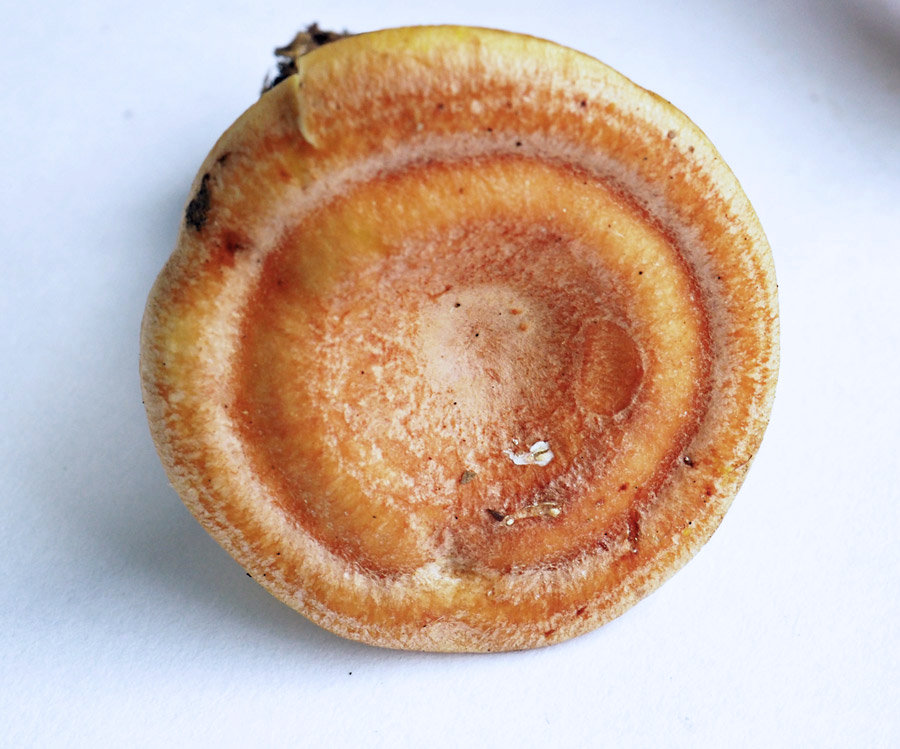 3.0-9.0cm 中央ややくぼんだ饅頭型→じょうご形 湿時弱粘性だが乾きやすい 帯黄色−帯やや黄淡肉色 濃色の同心環紋あり