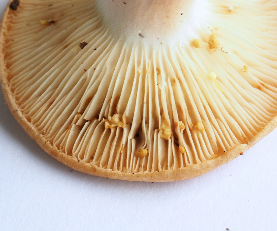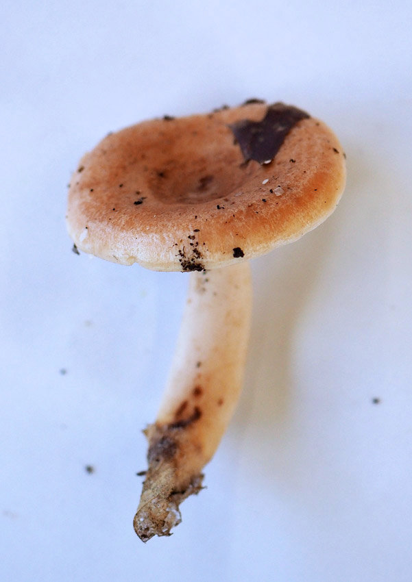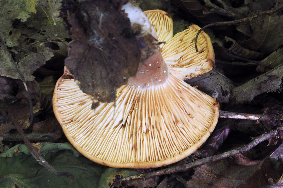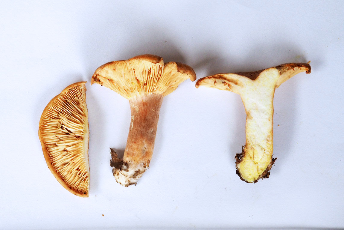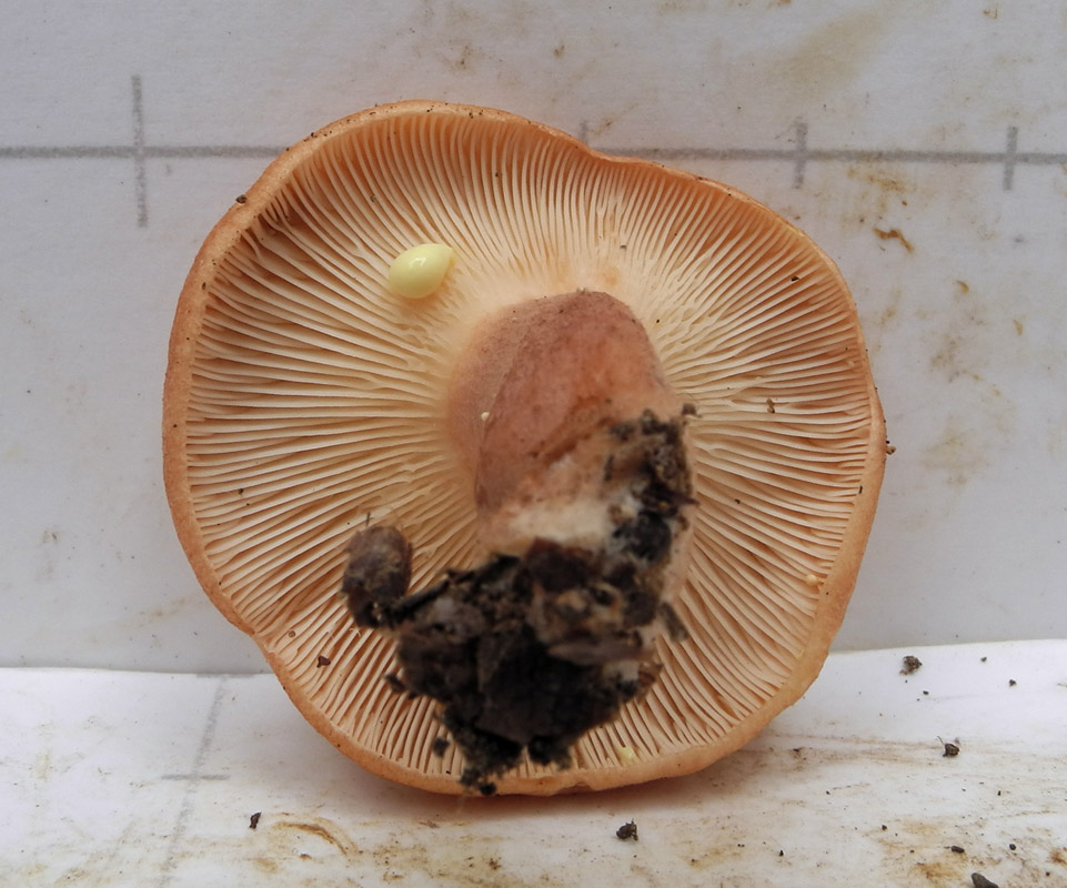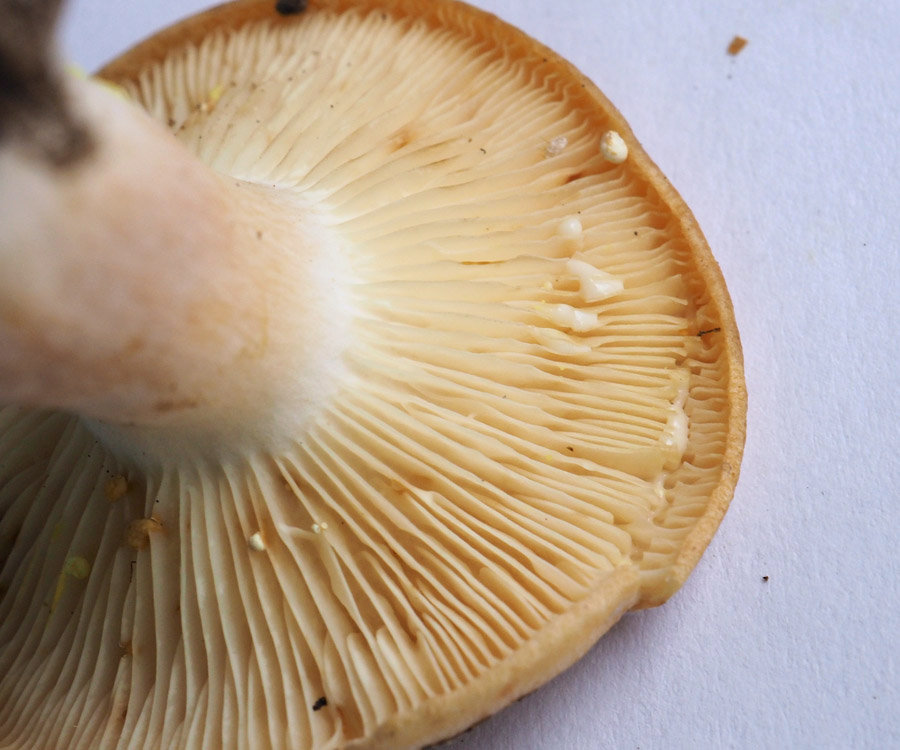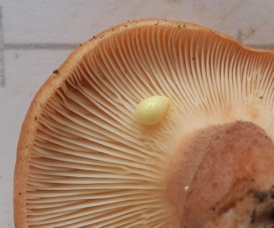 3.0-9.0cm 中央ややくぼんだ饅頭型→じょうご形 湿時弱粘性だが乾きやすい 帯黄色−帯やや黄淡肉色 濃色の同心環紋あり