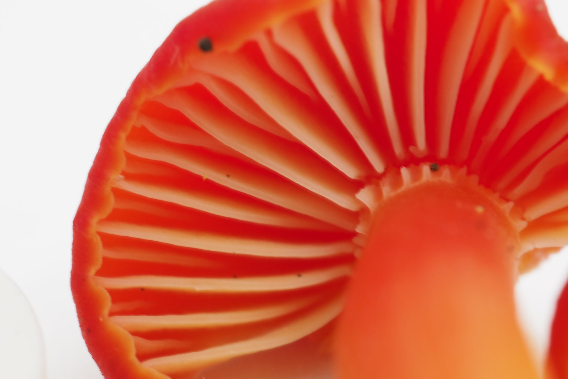1.5-3.0cm 丸山形→円錐状まんじゅう形→まんじゅう形 粘性無し 朱赤色−鮮赤色−橙赤色 周辺にやや条線あらわす