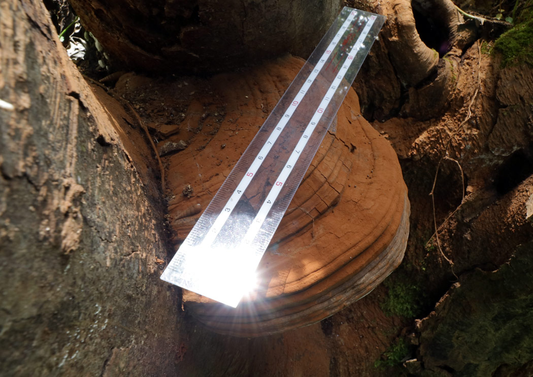 年々成長し50.0p以上×厚さ10.0-40.0cm 半円形−釣鐘形−ときに蹄形 灰白色−灰褐色 成長時の縁は黄白色 成長過程の環紋顕著 しばしばココアの粉をまぶしたような観を呈する 表面は硬い