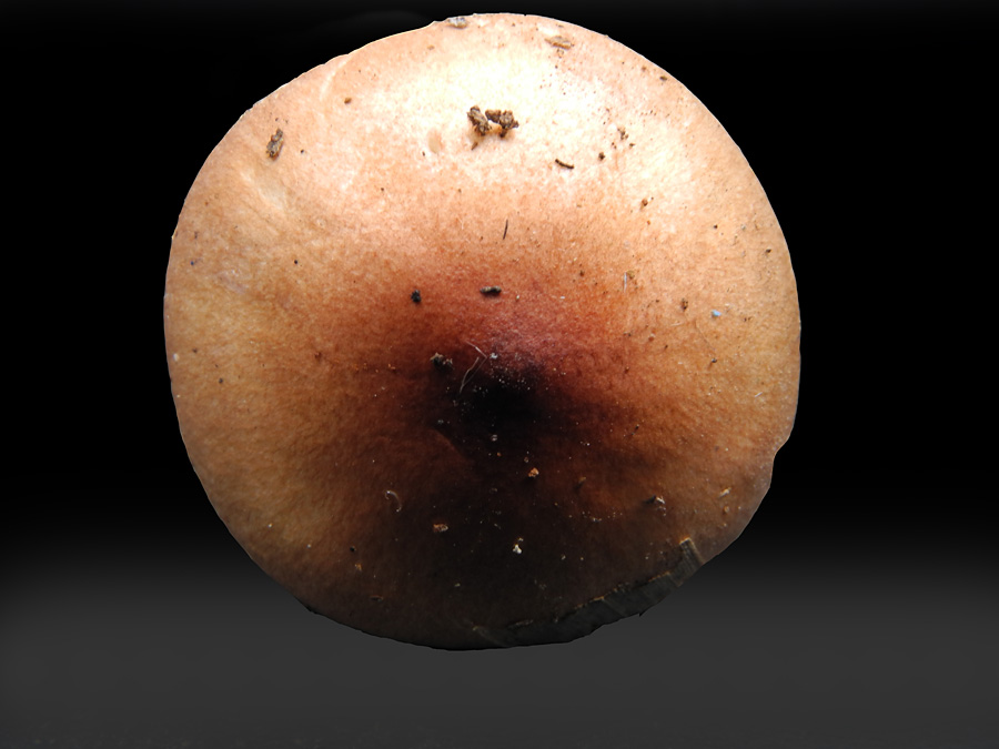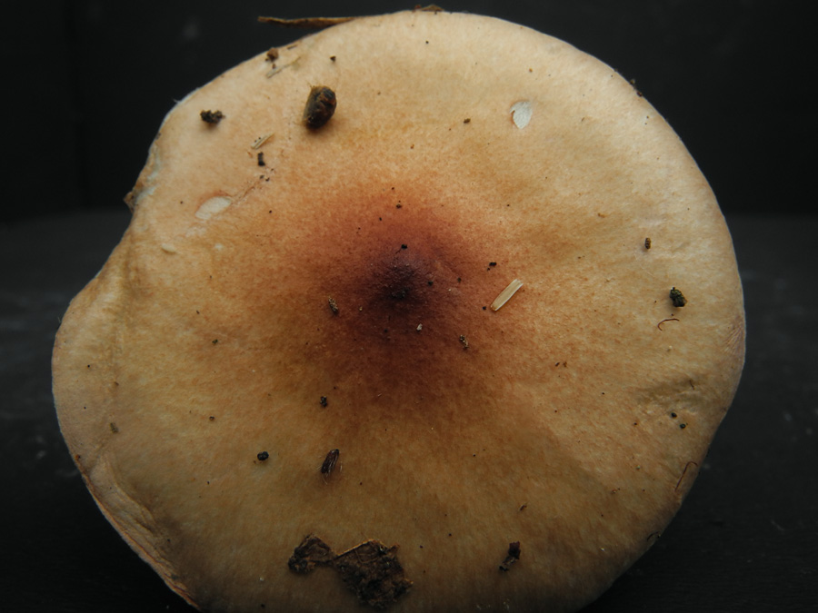 1.5-8.0cm 半球形→饅頭形→扁平→多少中高の皿型 繊維紋あり 中央部は茶褐色−煉瓦色 周辺は淡色 強粘性