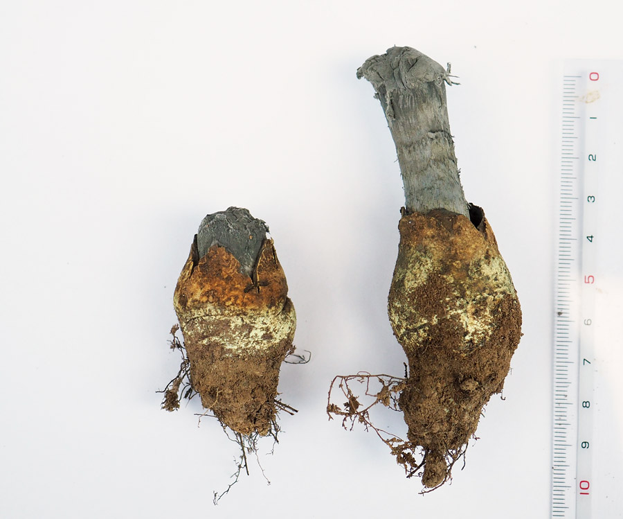円筒形 繊維状の縦条を表す 木質で折れにくい 頭部と柄部の境界不明瞭 ねずみ色−灰褐色ときに緑青色や黄白色混じる 中実 基部に黄褐色の袋