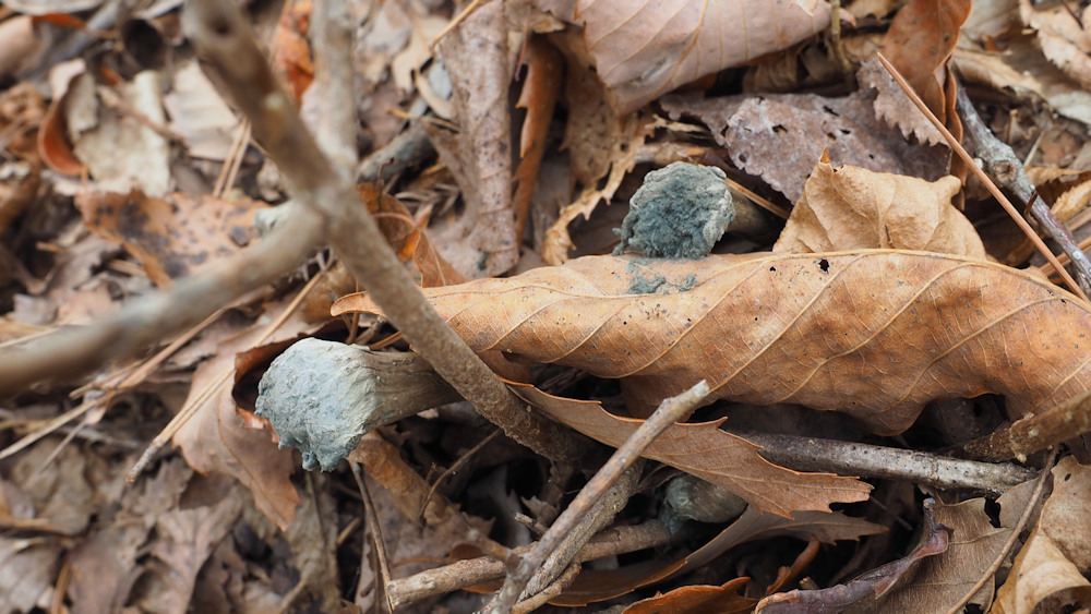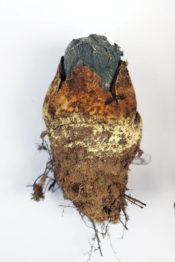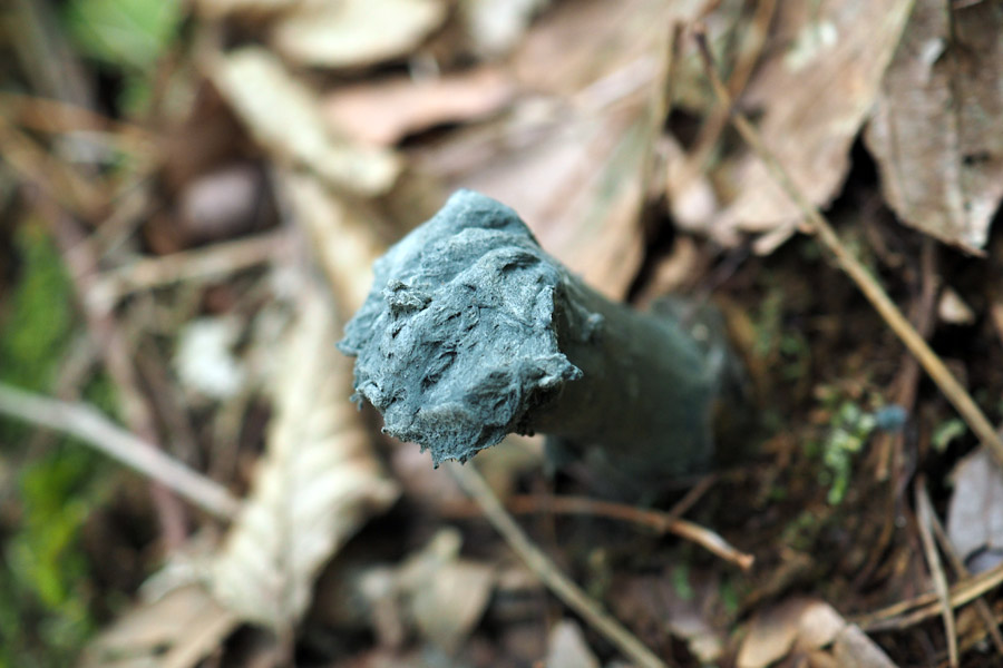 径1.0-3.0cm 頭部は柄よりやや太い ねずみ色−灰褐色ときに緑青色−黄白色混じる 頭部の上半分の殻皮は不規則な破片となって剥離し、帯青灰色の古綿状の胞子塊を露出