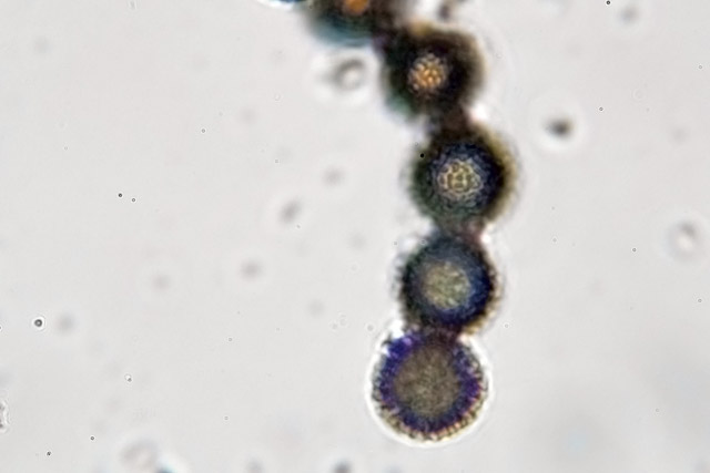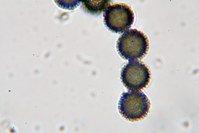 図鑑には担子菌とされているが、近年の発表では子嚢菌とのことである。子嚢胞子を確認するには、幼菌が地中にあり裂開する前に確認が必要とのこと