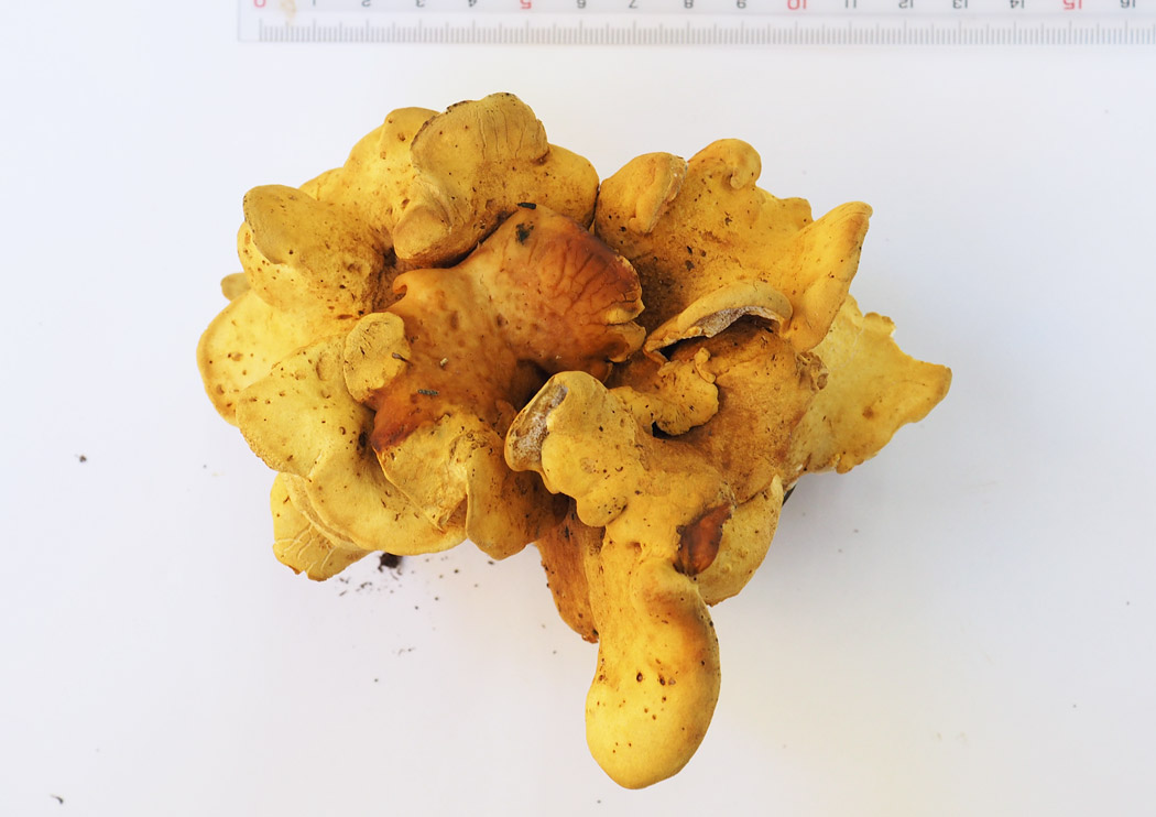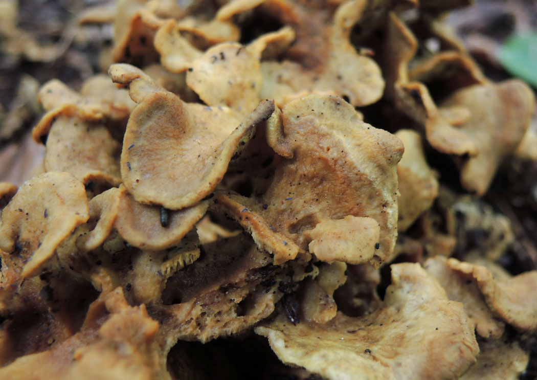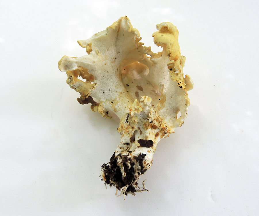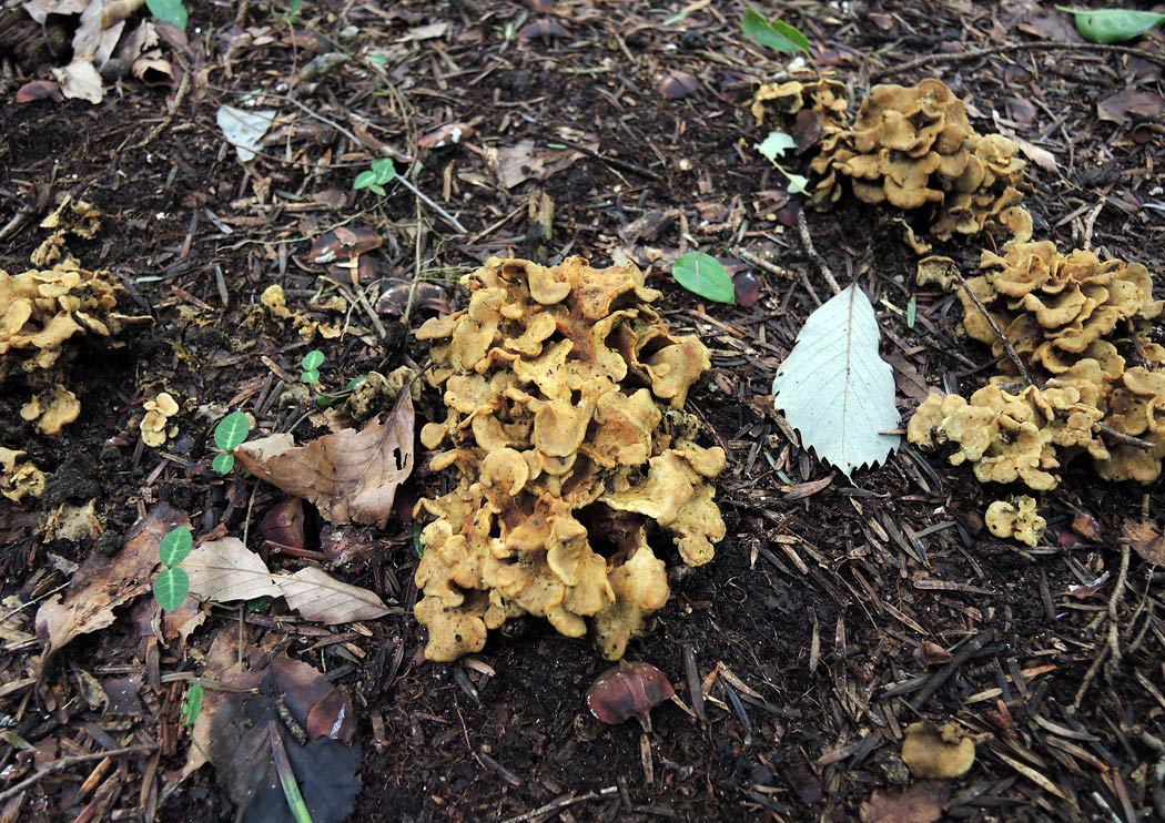5.0-15.0p×径5.0-20.0p余 著しく分岐した柄と多数の傘からなる 傘はへら形−扇形−半円形など かさの径3.0-10.0×厚さ2-3o 縁は下方に屈曲し波打つ 全体はマイタケ状 上面は鮮黄色 ほとんど平滑−細かい鱗被おびる