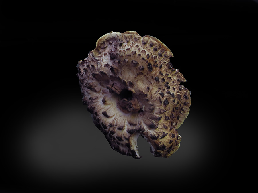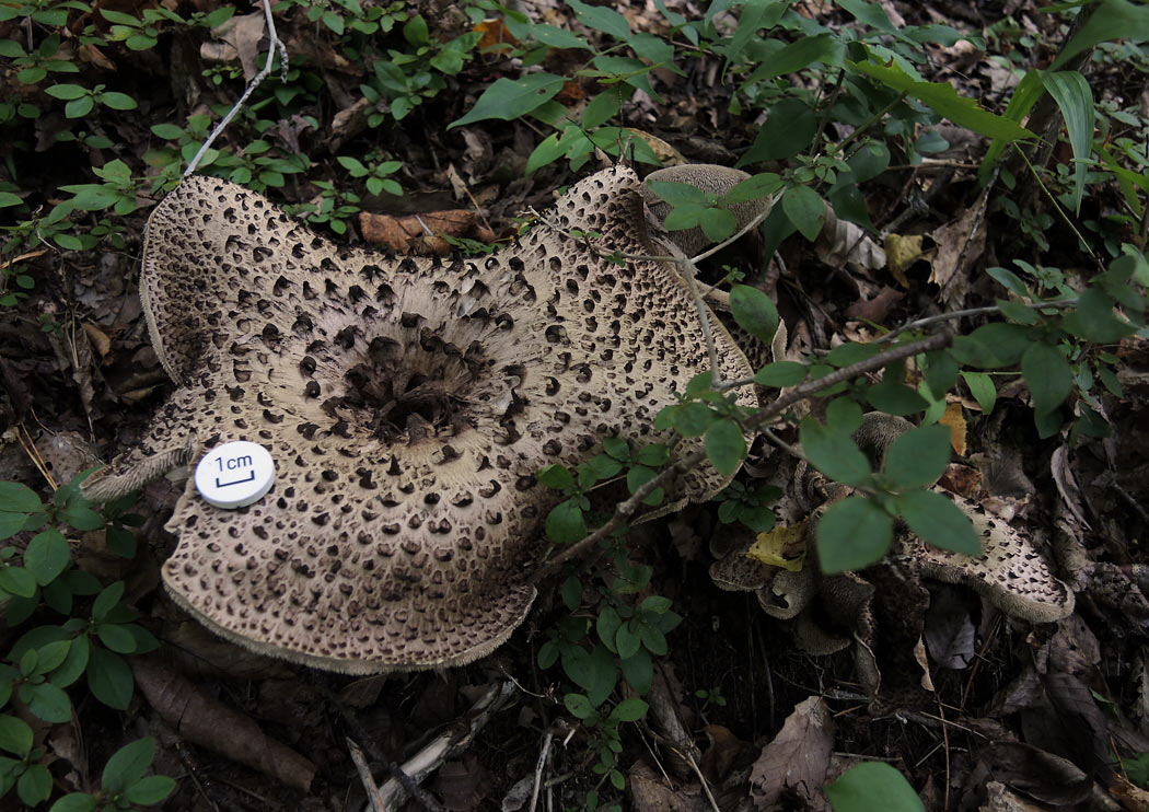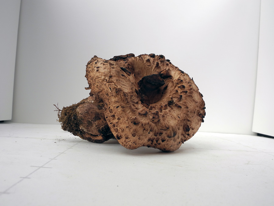 子実体の高さは10.0-20.0cm 傘の径は8.0-37.0p アサガオの花状に開いたろうと形 中央の窪みは柄の基部に達す 表面に強く反り返った中央ほど大きい粗大角形鱗片を密生 同心円状に密に並ぶ 桃色を帯びた淡褐色→紅褐色→黒褐色 乾くとほとんど黒色 触れると暗色化する