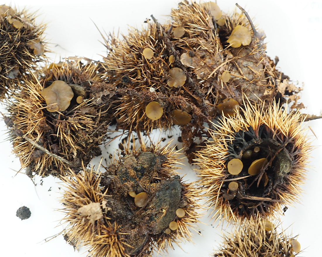 原色日本新菌類図鑑によると「Ciboria americana Durand」も栗のイガに発生するとのこと。この種は栗のイガの内外両面に発生するが、正確な同定葉顕微鏡観察が必須のようだ