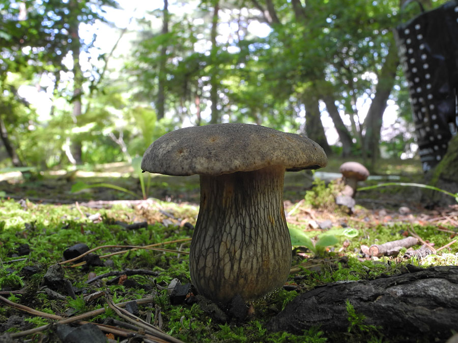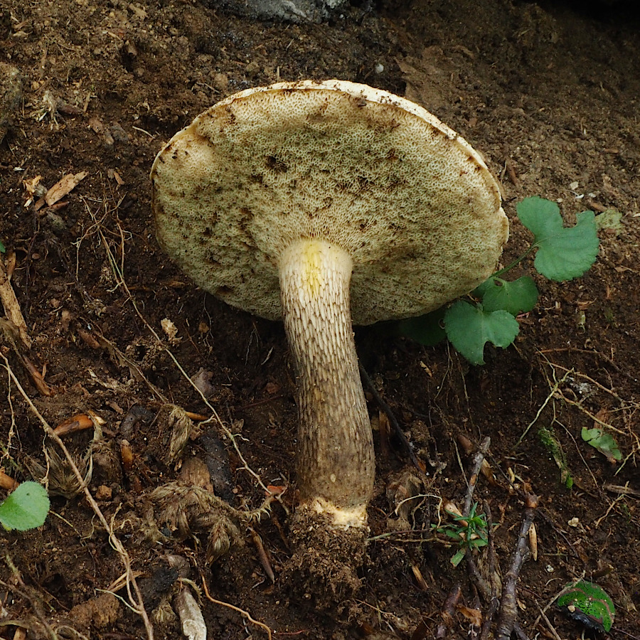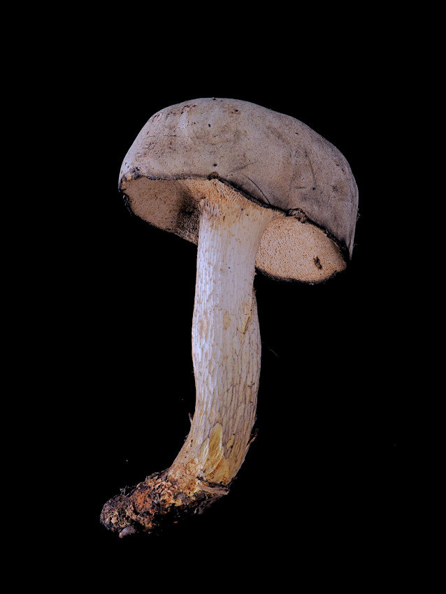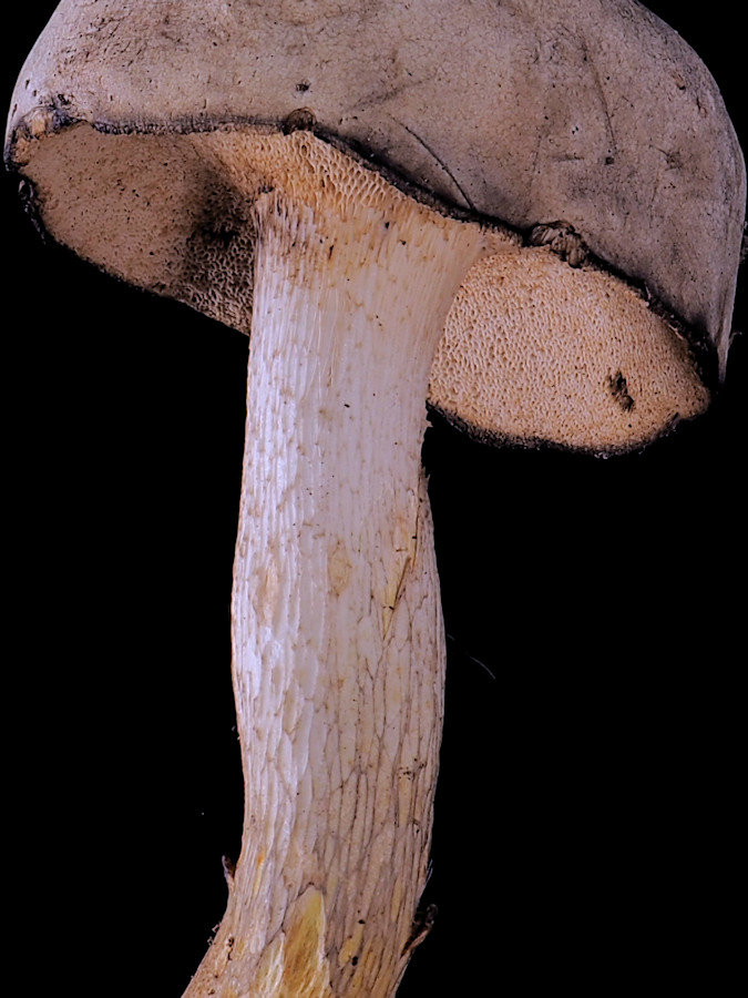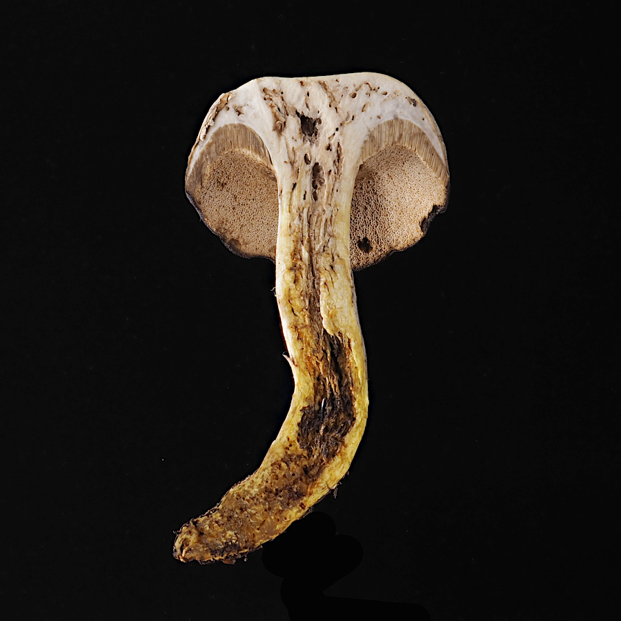 5.0-10.0cm×10-20mm 上下同福 基部細まり多少根状 上部でほぼ白色−灰白色 下方に向かって灰色−暗褐色 基部はしばしば帯褐黄色−帯褐橙色のしみ生じる 基部付近まで細かい網目模様あり 中実