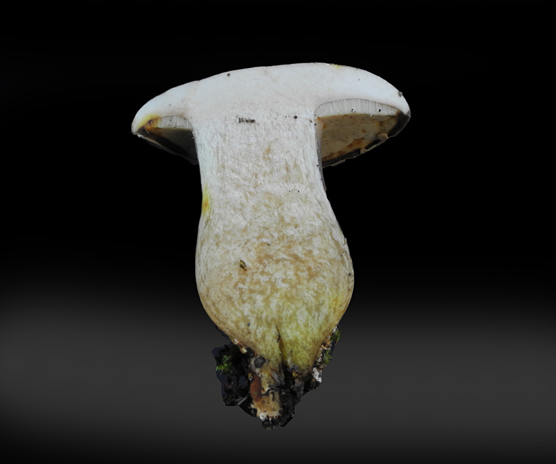 白色 切断で僅かに淡ピンク色 柄基部内部にしばしば帯褐黄色−帯褐橙色のしみが生じる