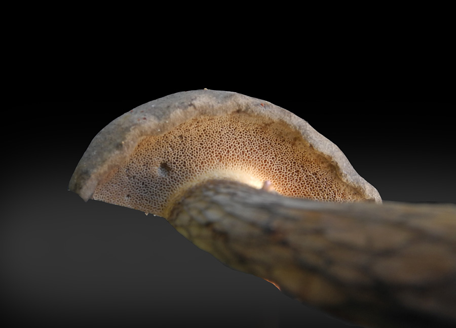 汚白色→淡灰褐色 直生 傷つくと褐色変 孔口も同様 孔口は多少角形 径1o以下