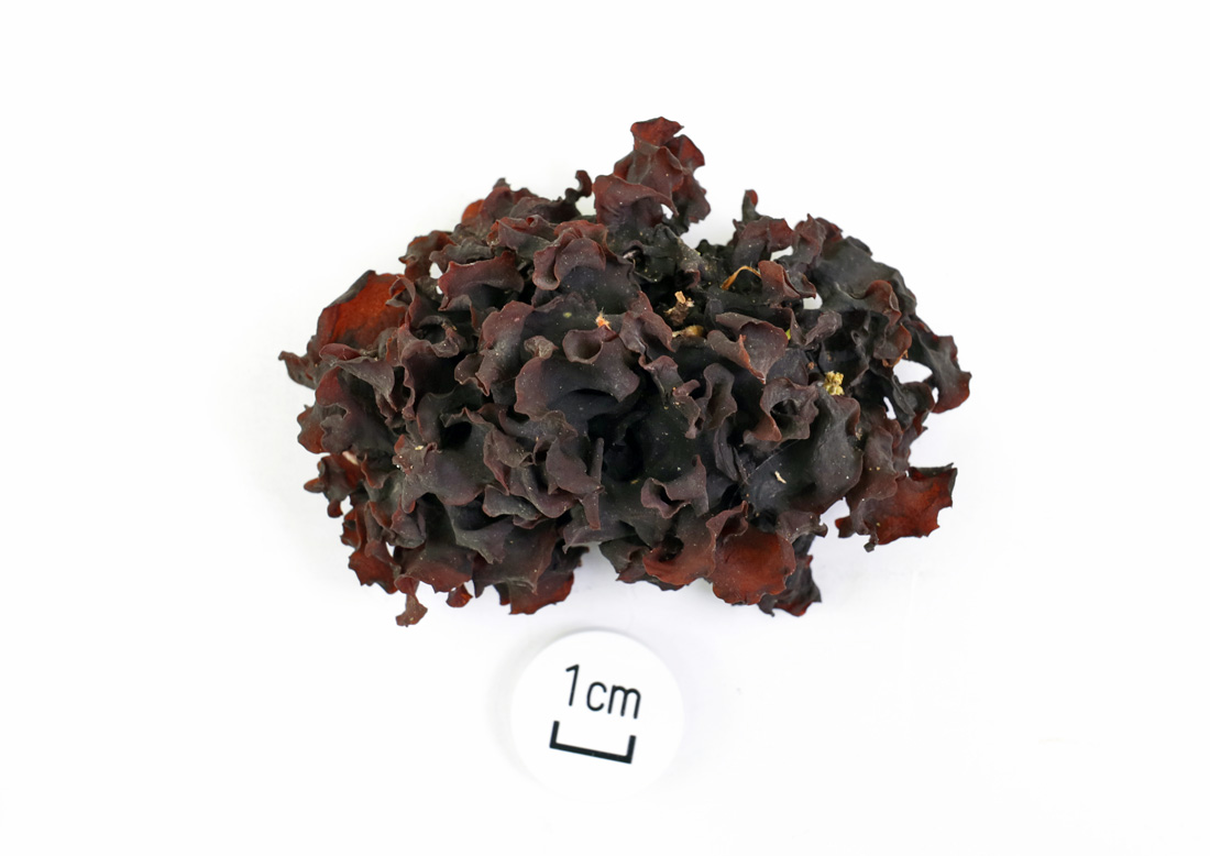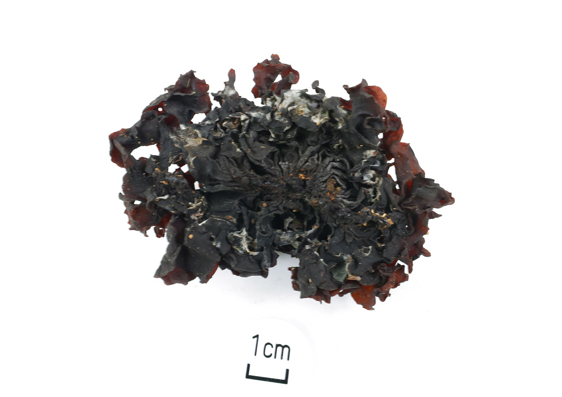 高さ5.0p前後 不規則な花びら状裂片が重なりとなる 乾燥状態で日が当たると赤褐色−日影ではほとんど黒褐色 湿時暗褐色 乾燥時黒褐色 乾燥すると収縮し堅くなる 湿時やや硬いゼラチン質 切片はかなり薄く1mm未満