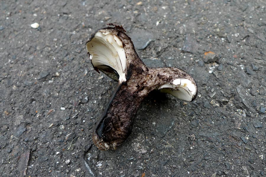 5.0-10.0cm 中央窪む饅頭形→ろうと形 幼時縁部強く内巻き 平滑 湿時粘性 ほとんど白色→灰褐色→黒褐色