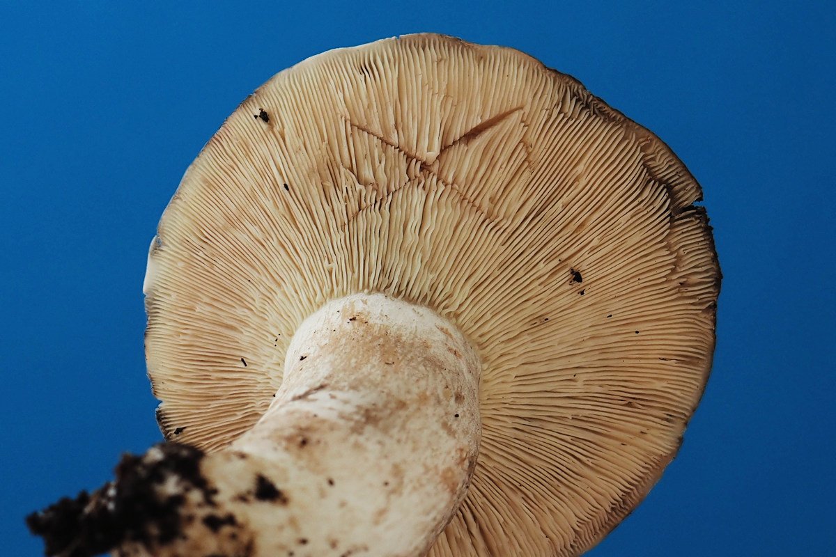 淡帯黄白色 傷つくと赤変→灰色−黒色に変色する 直生状垂生−離生 幅狭い(3o前後) 密