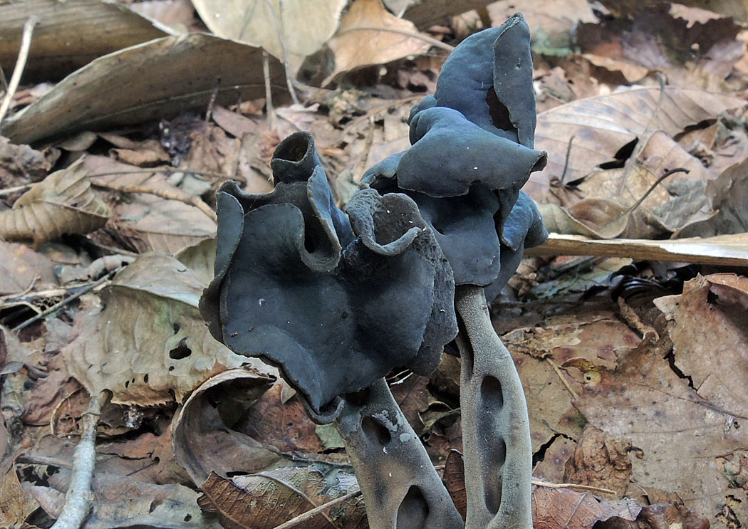 不整形な鞍形−比較的整った鞍形 縁は内に巻く 子実層面はj平滑−凹凸やしわ状 濃灰色−ほとんど黒色 裏面は灰白色で平滑 無毛 子嚢盤の縁は内側に曲がらず柄に合着する