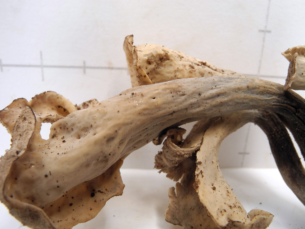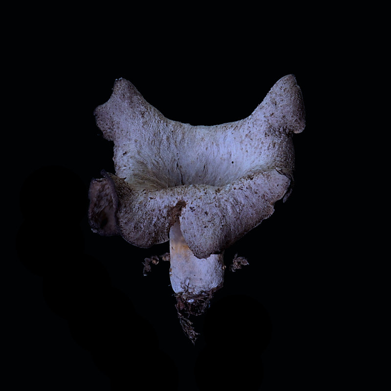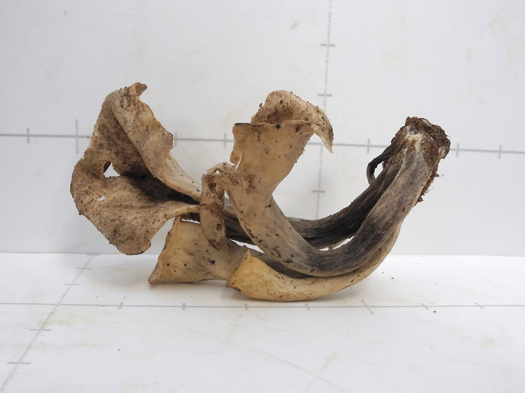 径1.0-6.0p 非常に薄い膜質−柔軟な肉質 不整円形または縁は浅く裂けていちじるしく屈曲 表面はねずみ色−灰褐色 細かい鱗被おびる